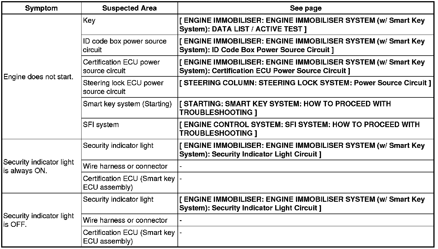 ENGINE IMMOBILISER: ENGINE IMMOBILISER SYSTEM (w/ Smart Key System): PROBLEM SYMPTOMS TABLE