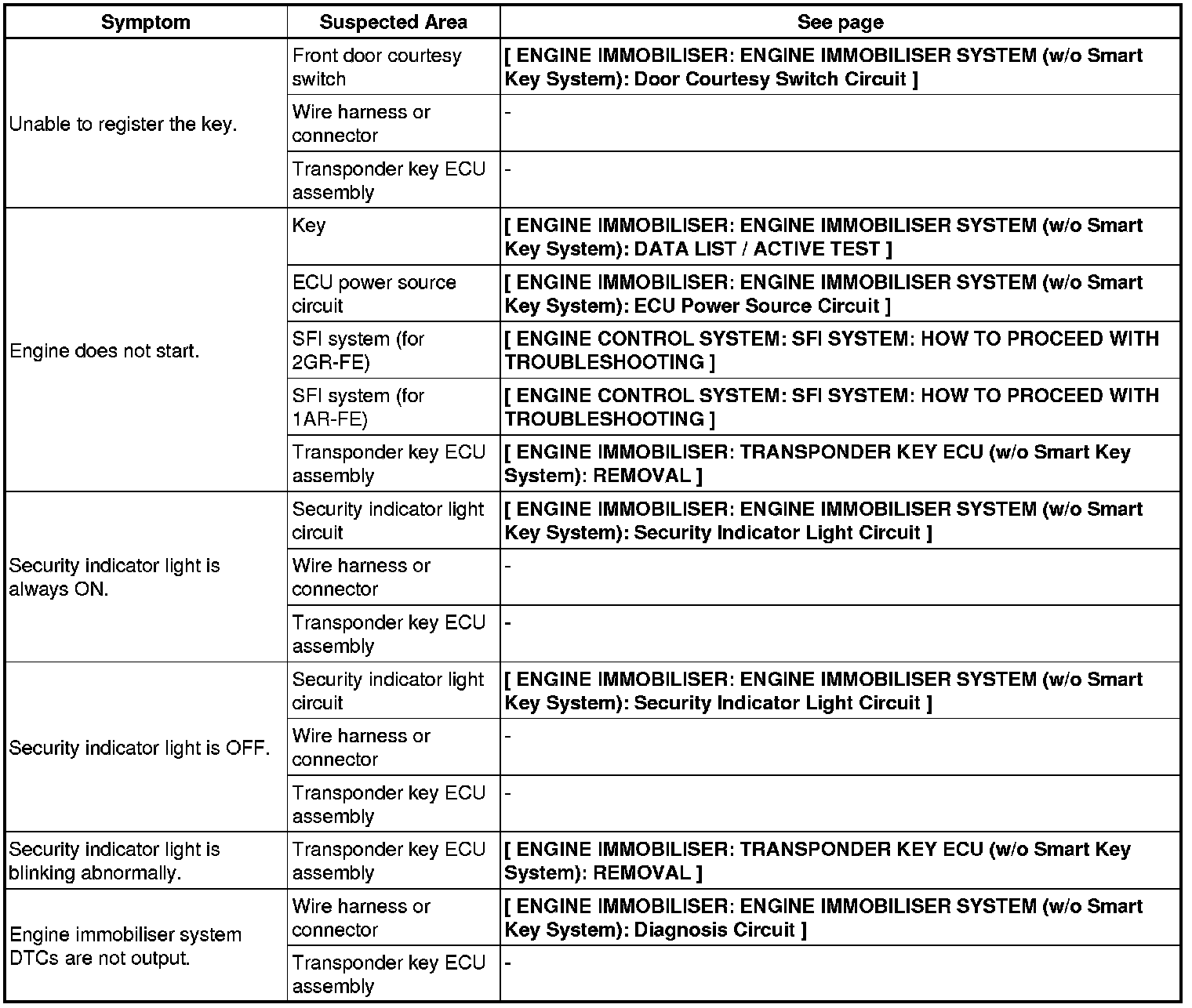 ENGINE IMMOBILISER: ENGINE IMMOBILISER SYSTEM (w/o Smart Key System): PROBLEM SYMPTOMS TABLE