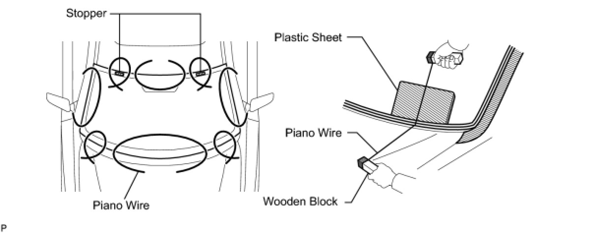 * To prevent the instrument panel from being scratched when removing the windshield glass sub-assembly, place a plastic sheet between the piano wire and instrument panel.