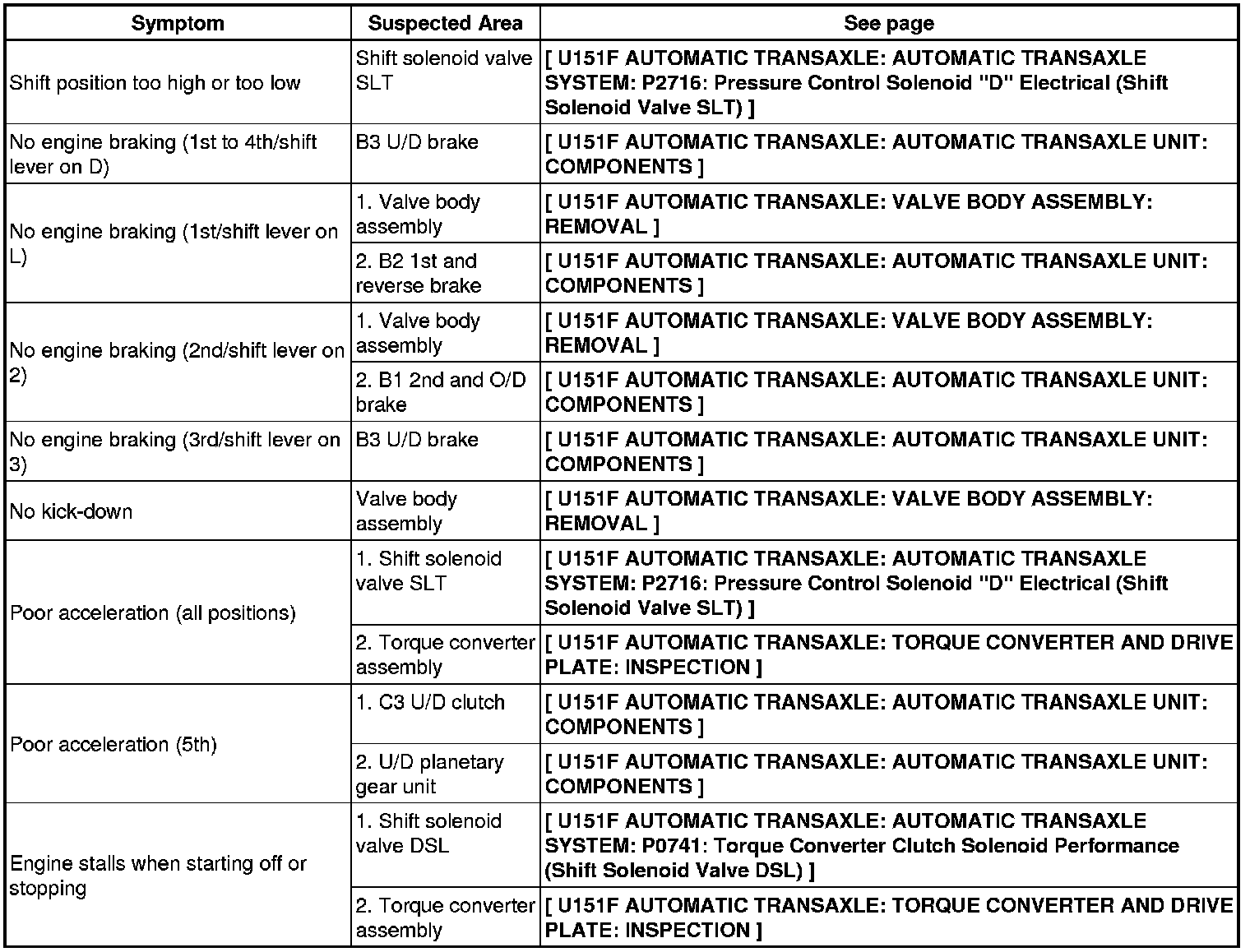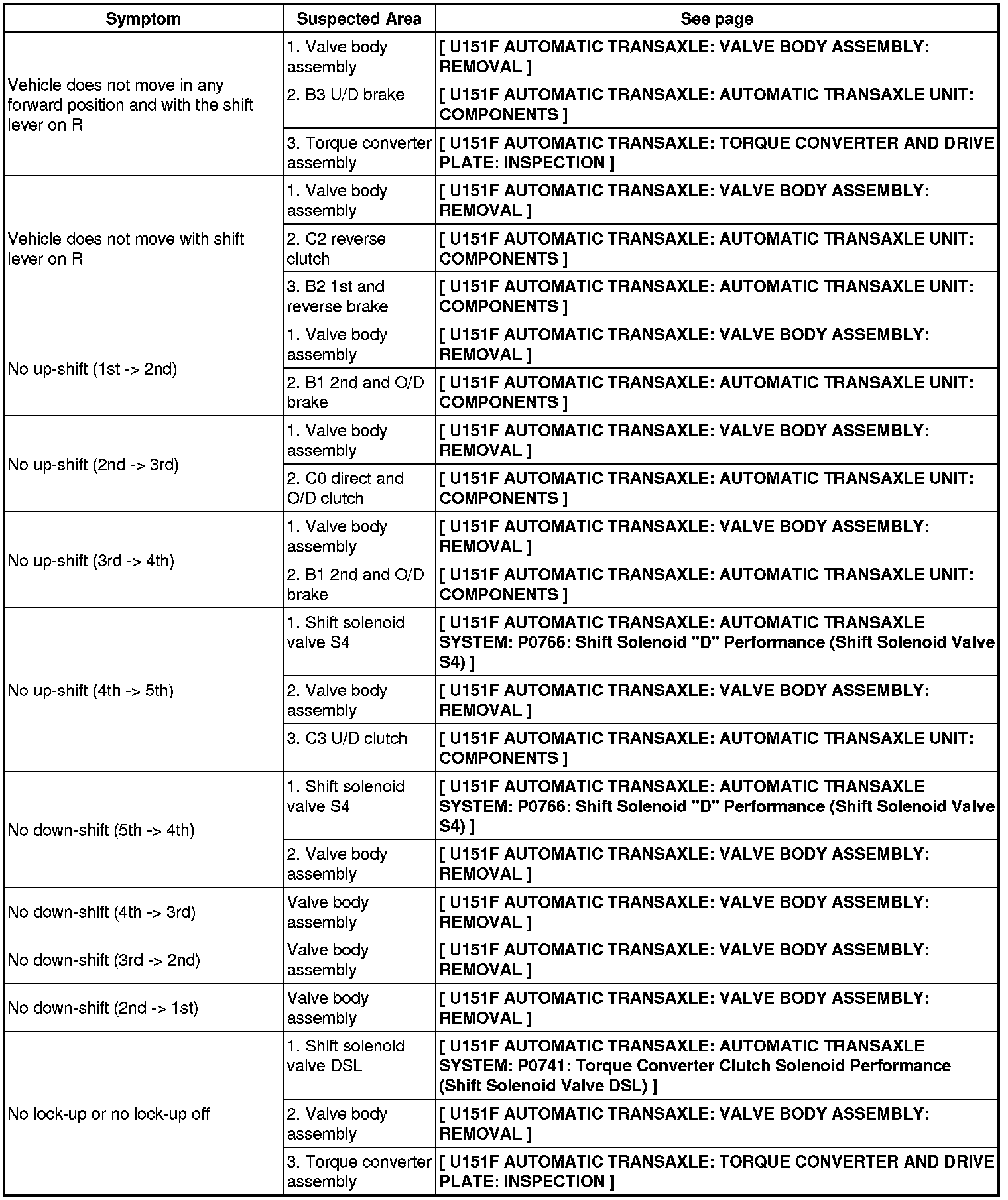 U151F AUTOMATIC TRANSAXLE: AUTOMATIC TRANSAXLE SYSTEM: PROBLEM SYMPTOMS TABLE