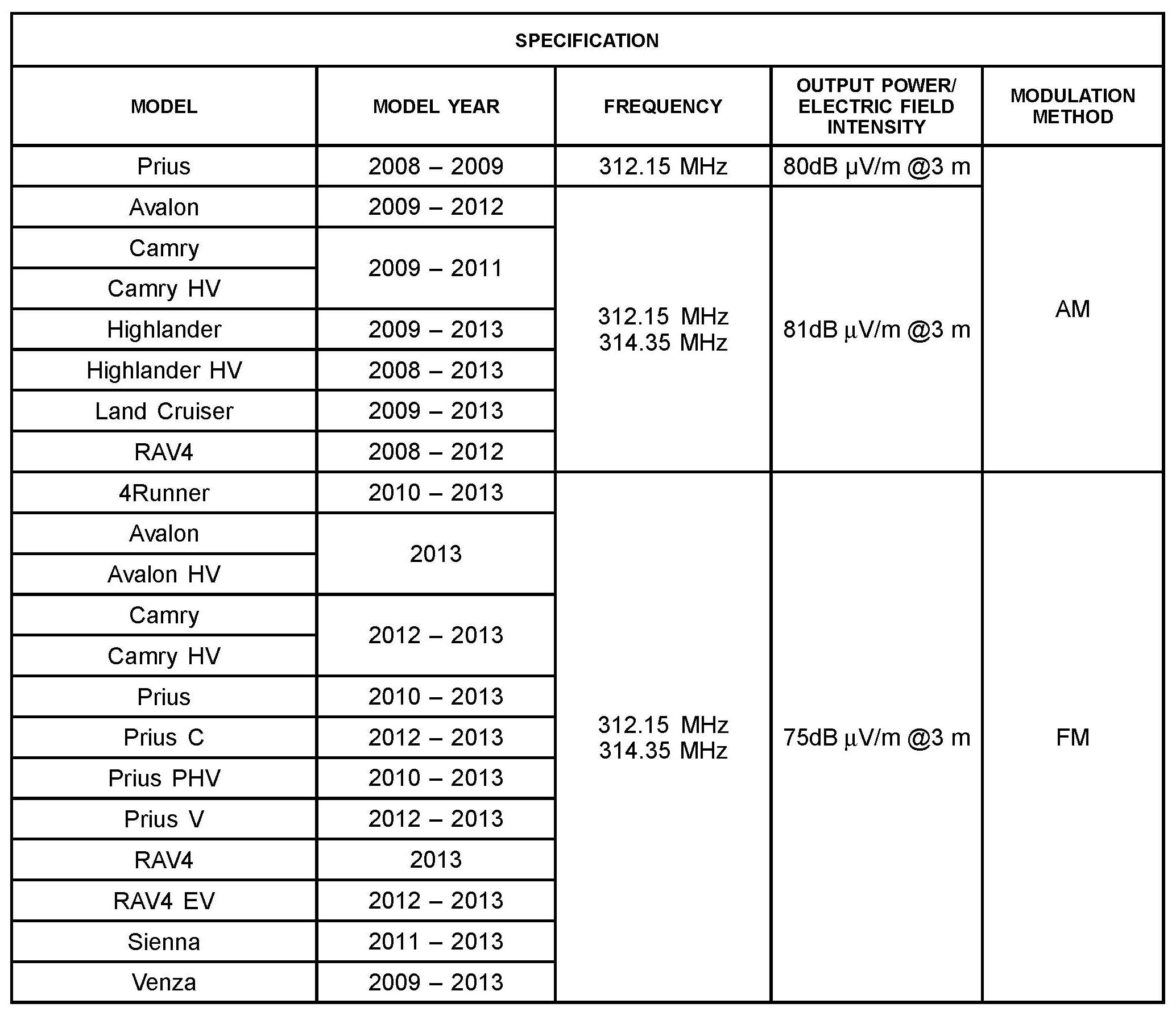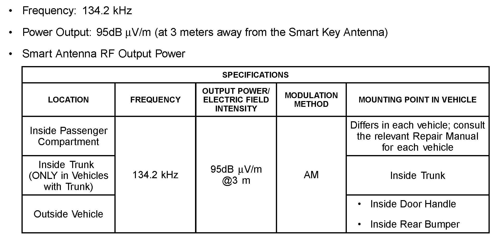 Some customers may inquire about the frequency and power output of the SmartKey/Smart Entry Systems used on various models. The Smart Key/Smart Entry systems conform to all applicable FCC rules. This bulletin details the applicable specifications for these systems.