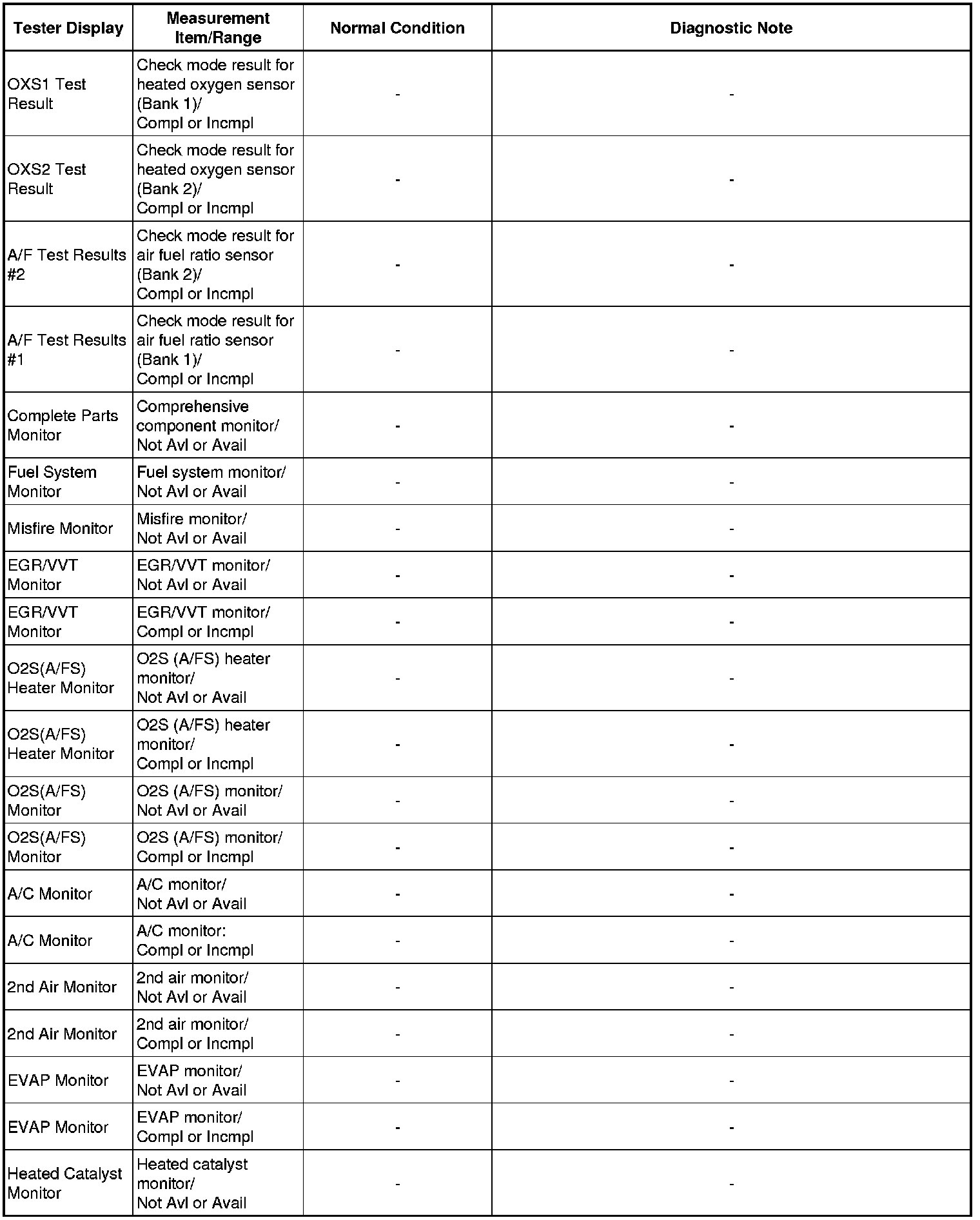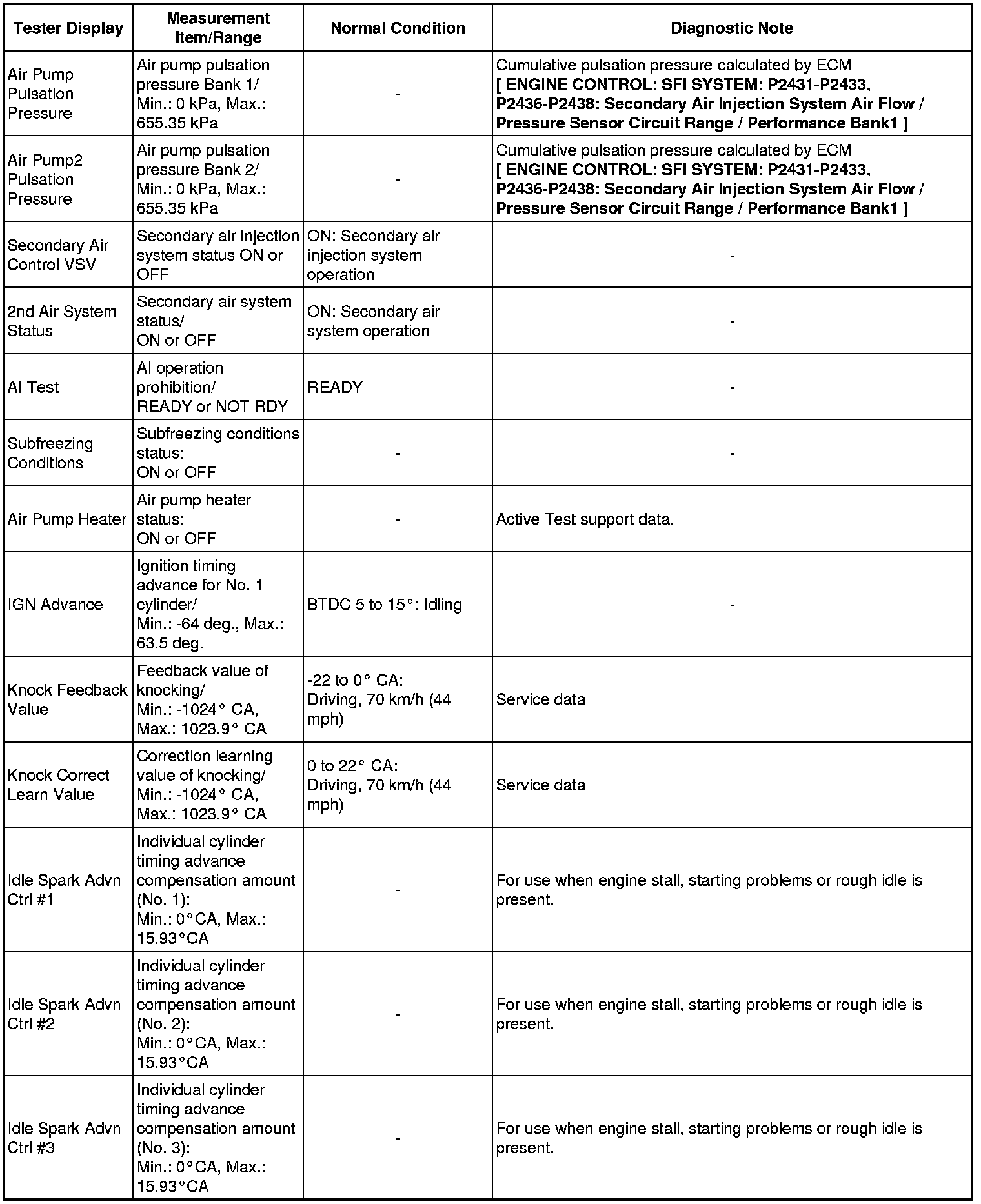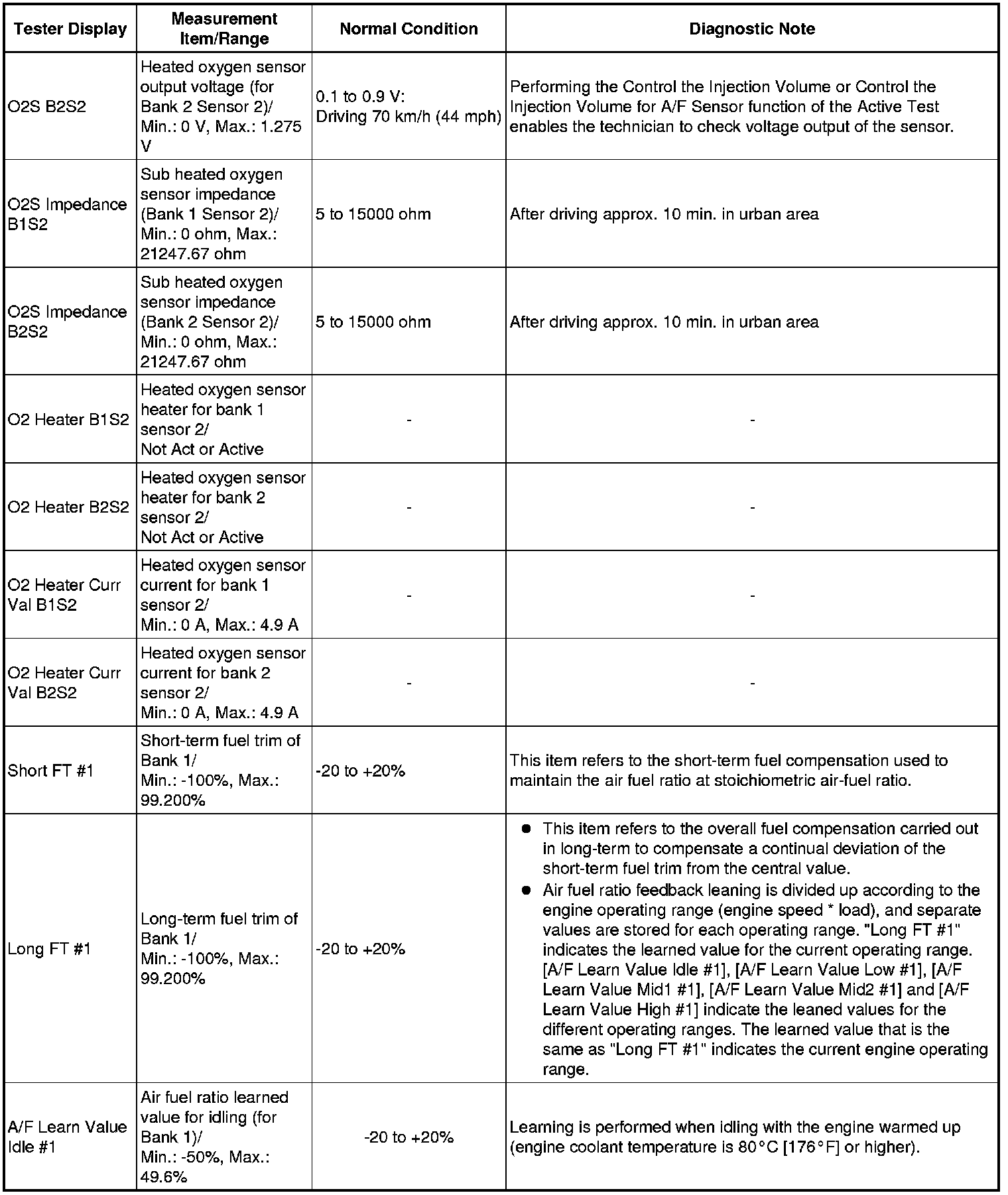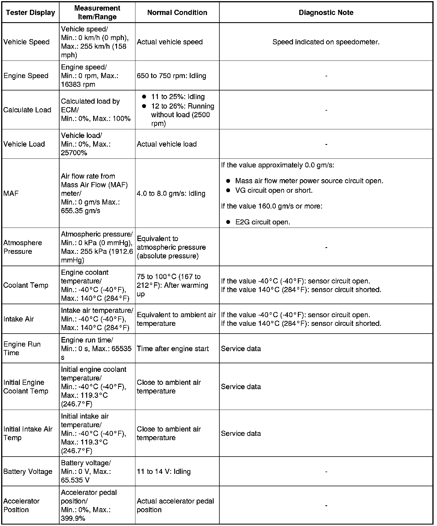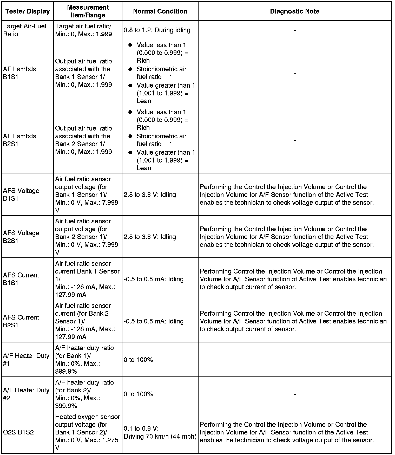 * Normal Condition: If no conditions are specifically stated for "idling", the shift lever is in N or P, the A/C switch is off, and all accessory switches are off.