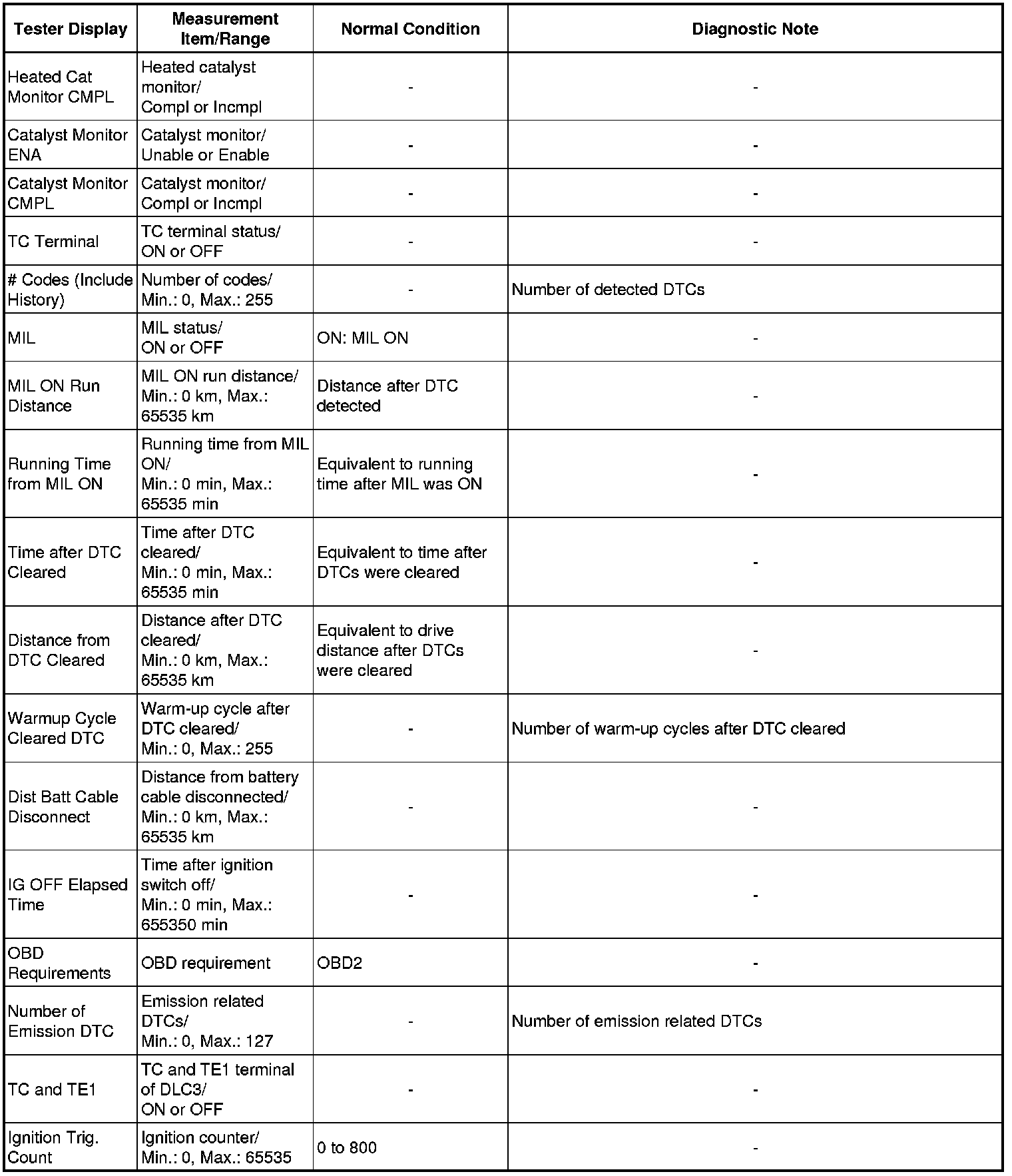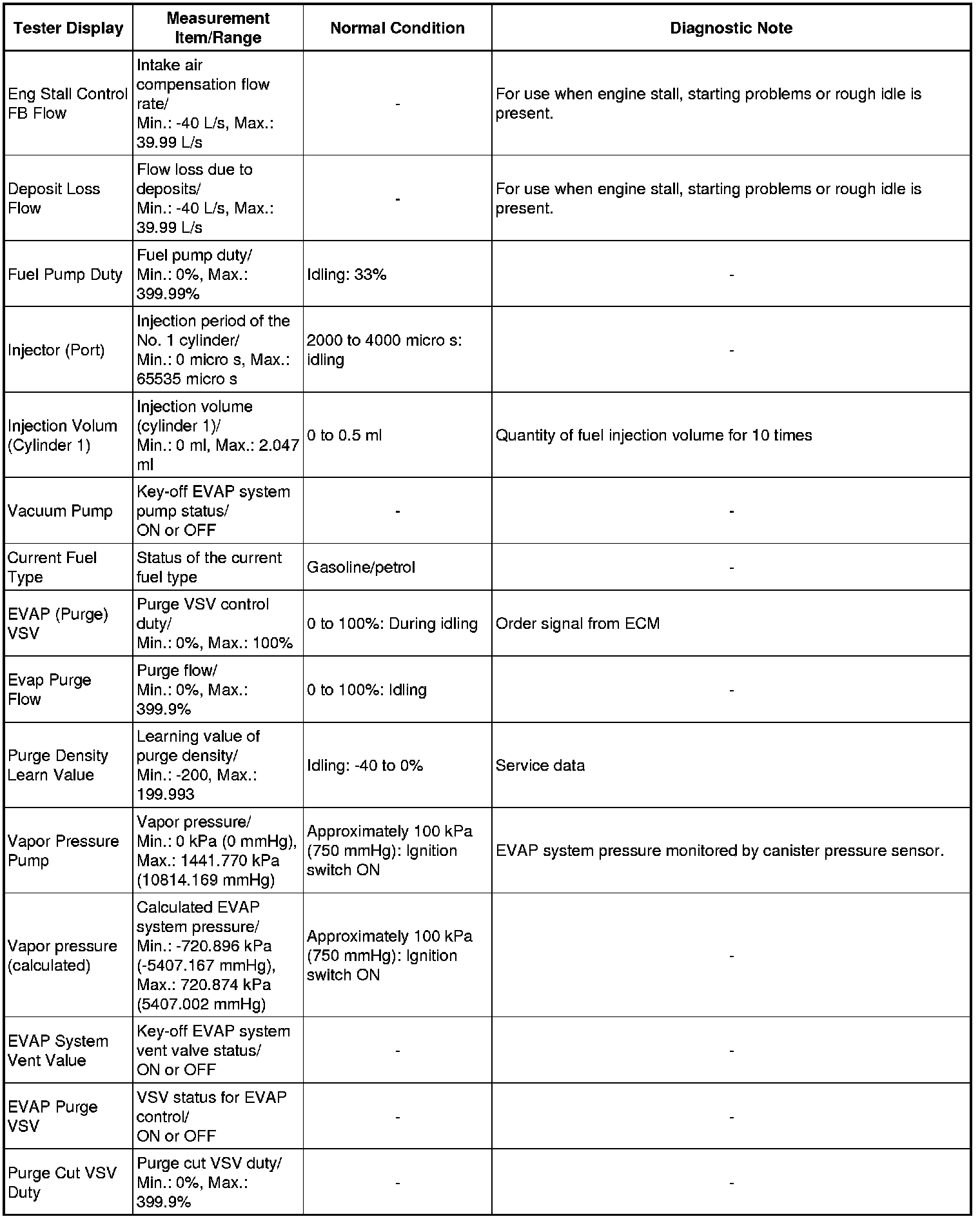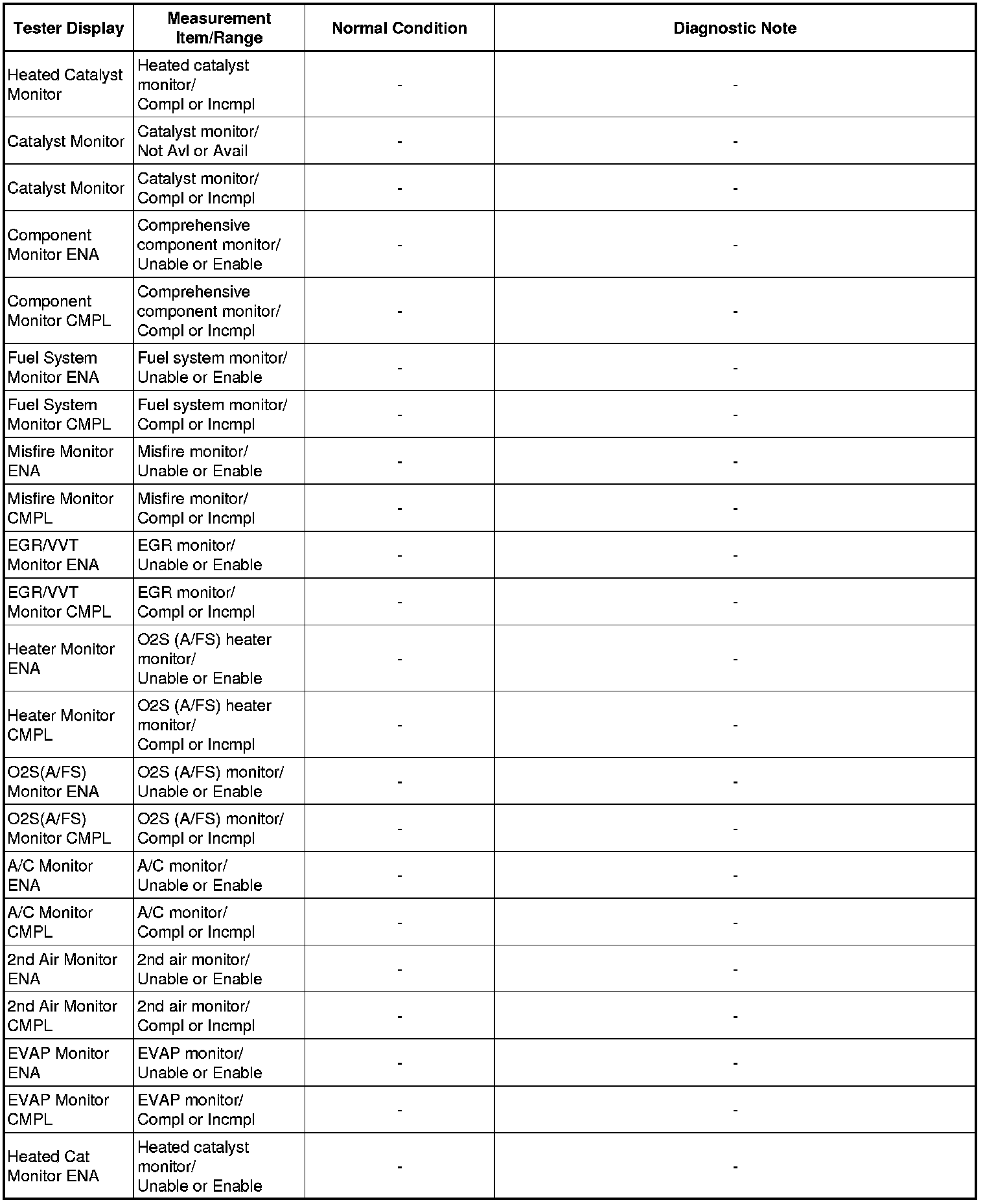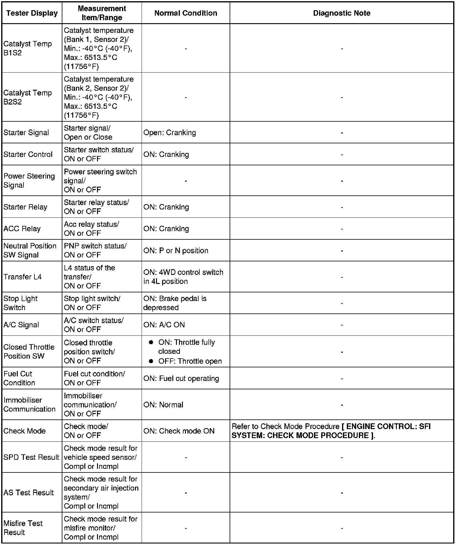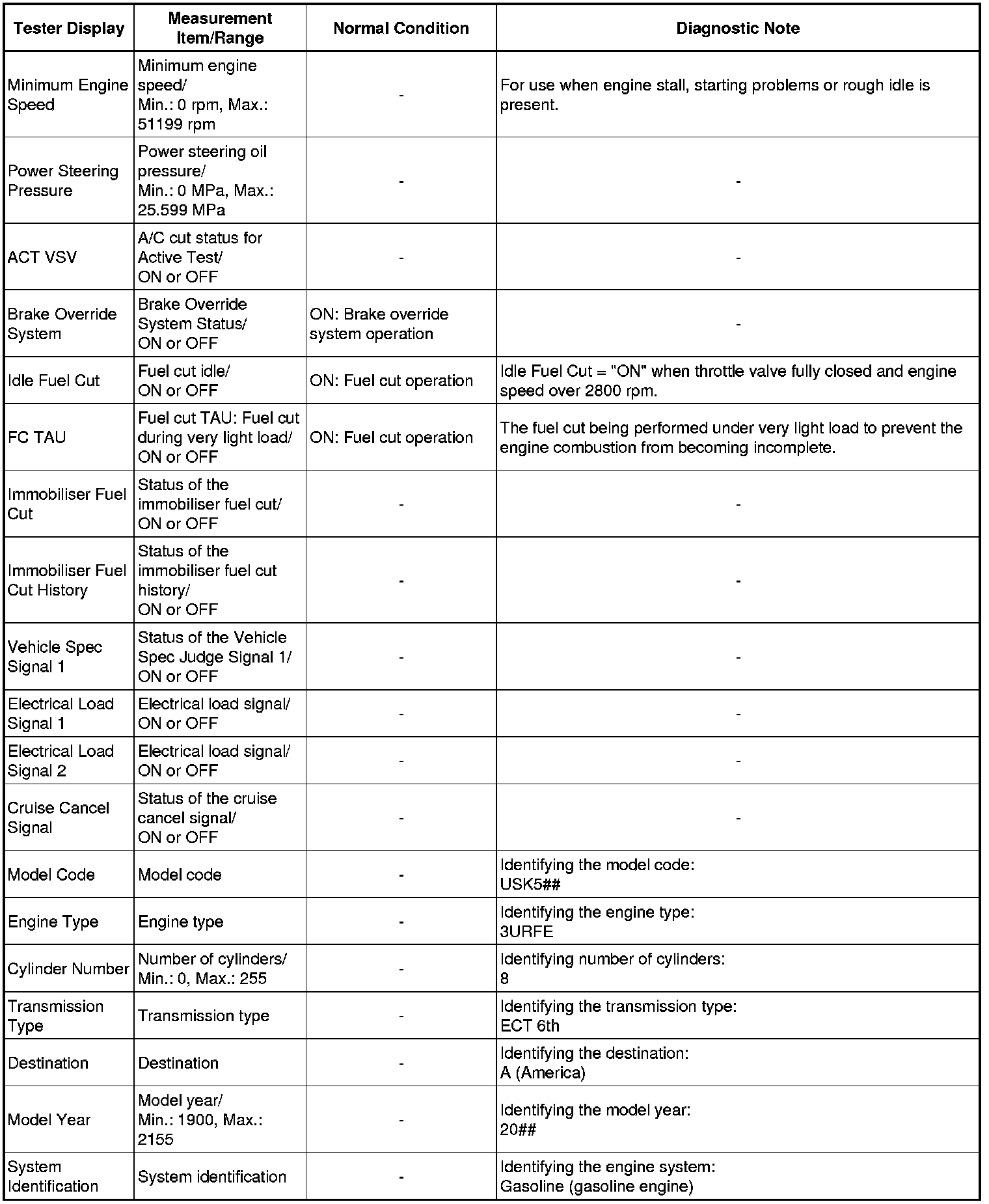 * Normal Condition: If no conditions are specifically stated for "idling", the shift lever is in N or P, the A/C switch is off, and all accessory switches are off.