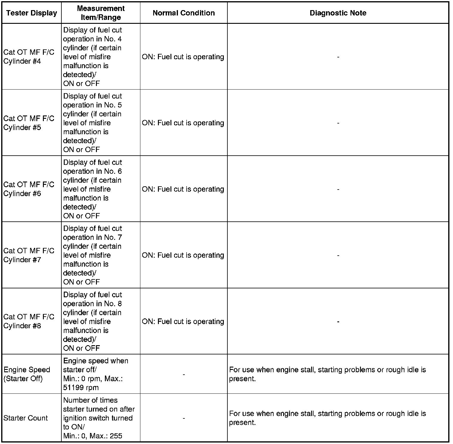 At first, the Techstream display will show each cylinder's engine speed measurement to be extremely high. After approximately 10 seconds of engine cranking, each cylinder's engine speed measurement will change to the actual engine speed.