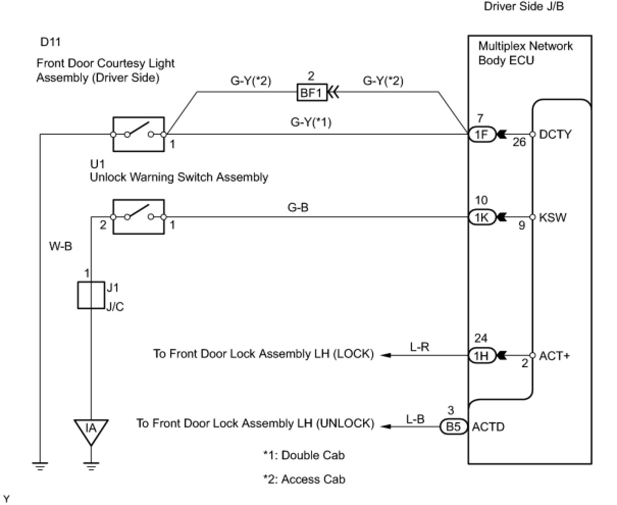 To prevent the key from being locked in the vehicle, the multiplex network body ECU prevents the doors from being locked by monitoring 2 switches: 1) the unlock warning switch, which turns ON when the key is inserted into the ignition key cylinder; and 2) the driver side courtesy light switch, which turns ON when the driver side door is opened.