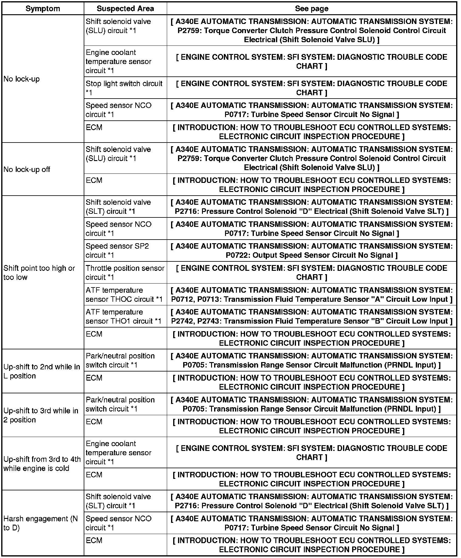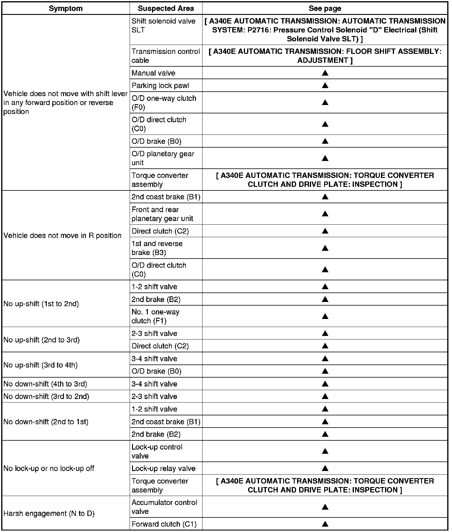 A340E AUTOMATIC TRANSMISSION: AUTOMATIC TRANSMISSION SYSTEM: PROBLEM SYMPTOMS TABLE