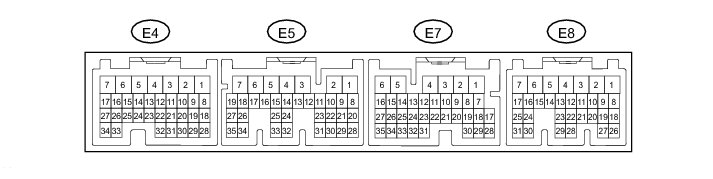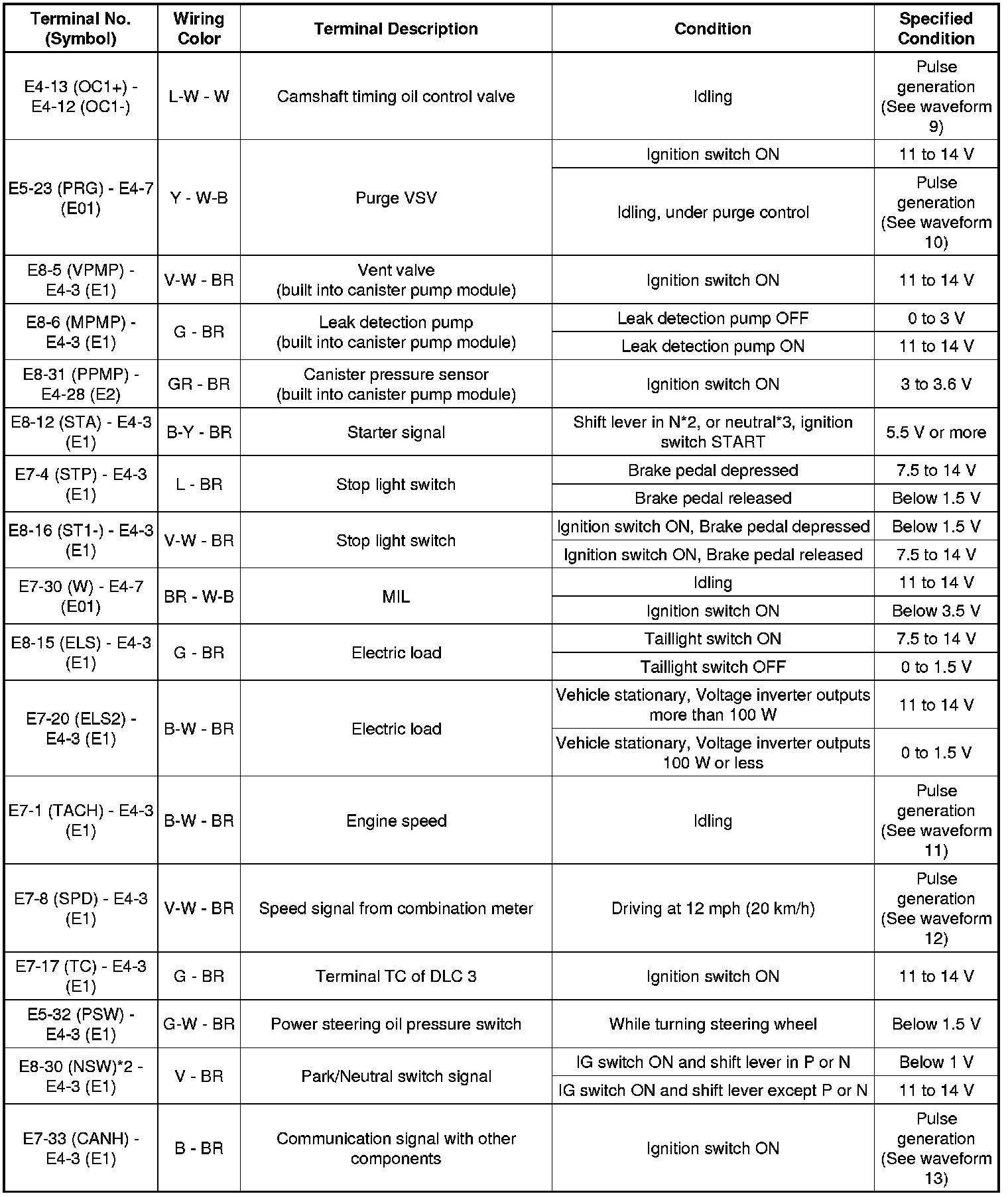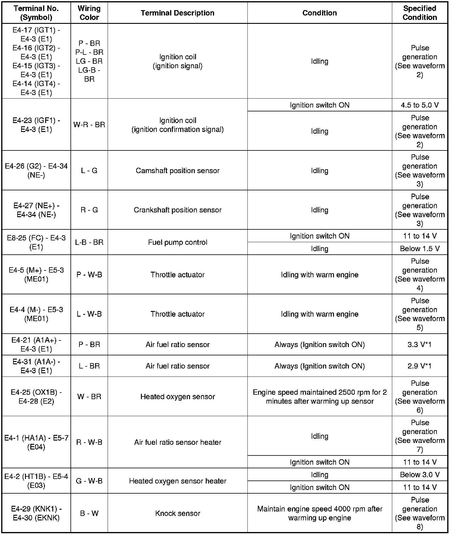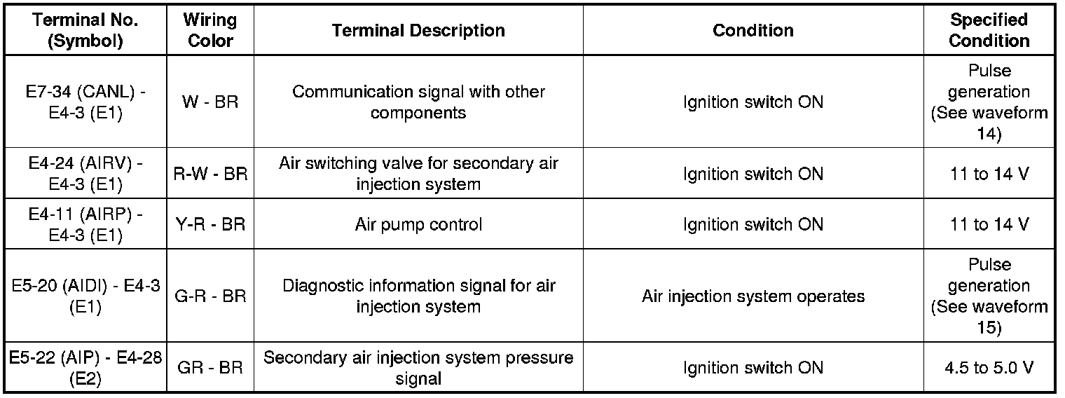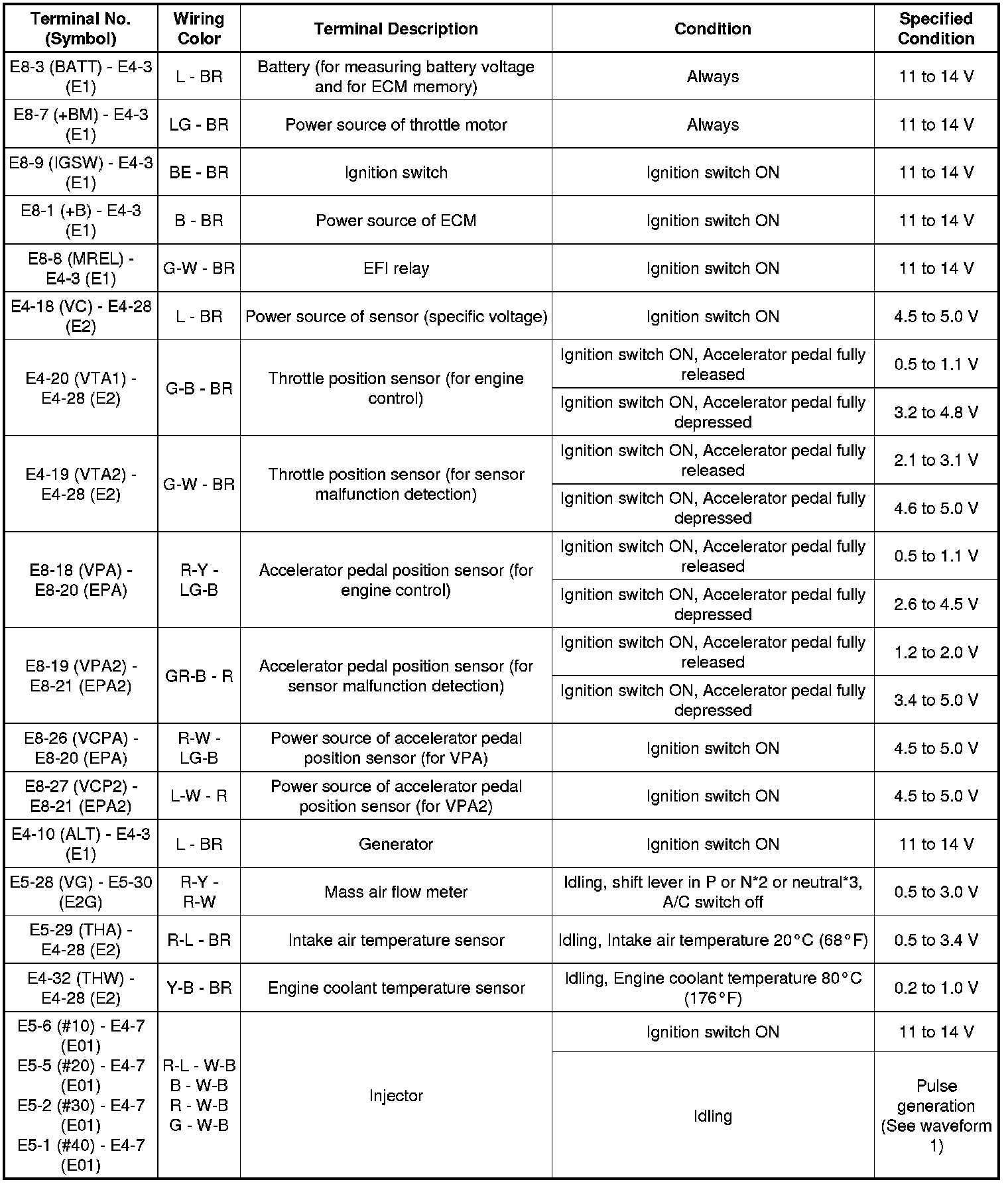 The standard normal voltage between each pair of ECM terminals is shown in the table below. The appropriate conditions for checking each pair of terminals are also indicated. The result of checks should be compared with the standard normal voltage for that pair of terminals, displayed in the Specified Condition column. The illustration above can be used as a reference to identify the ECM terminal locations.