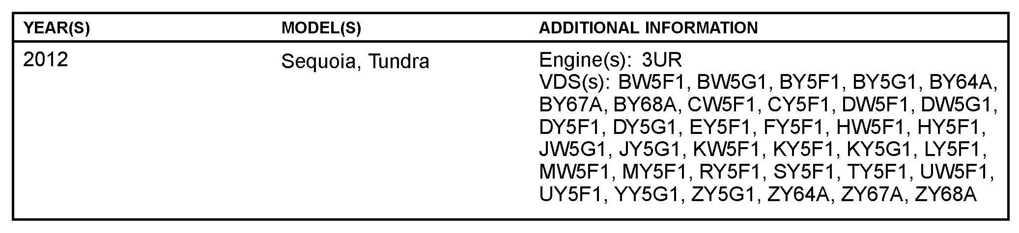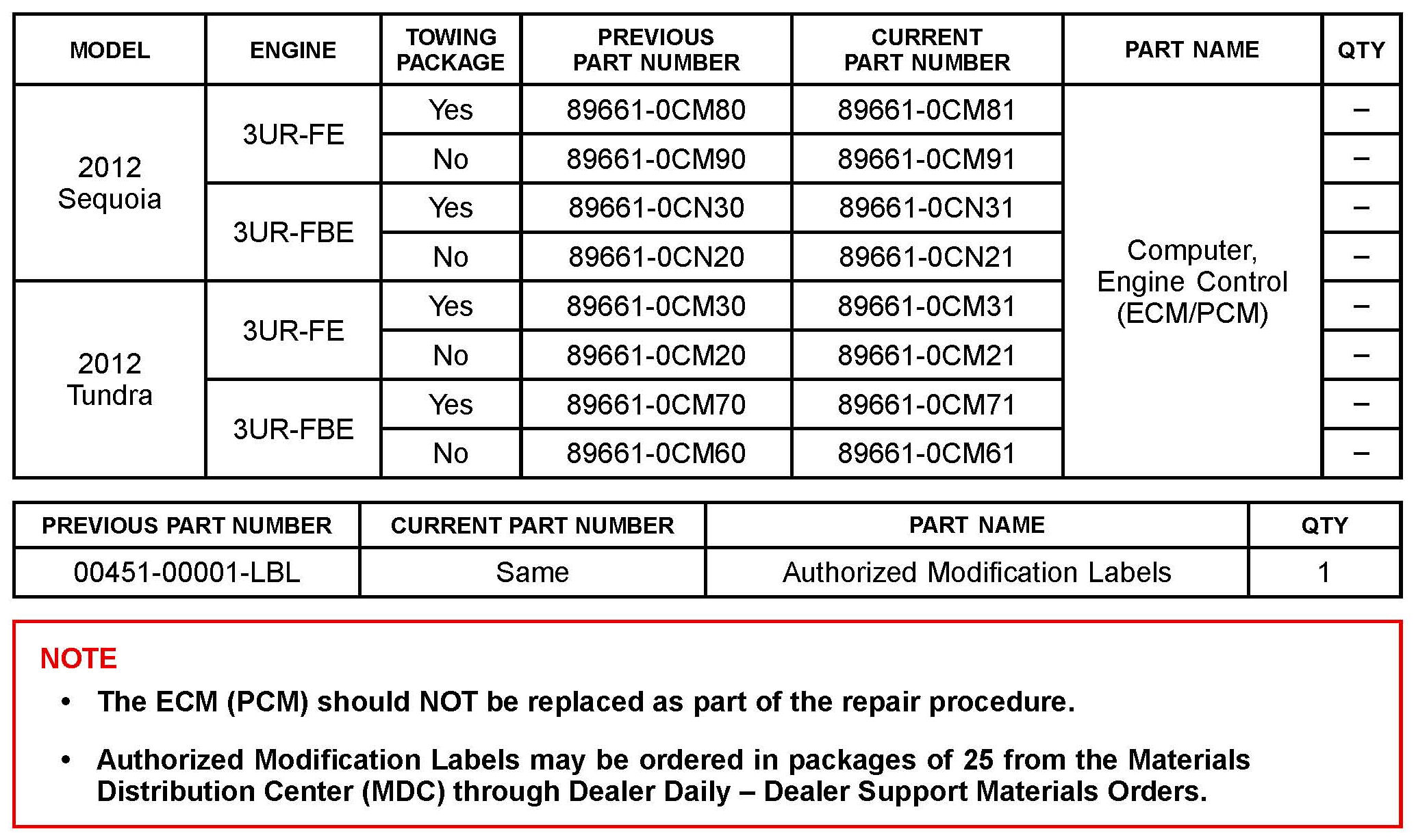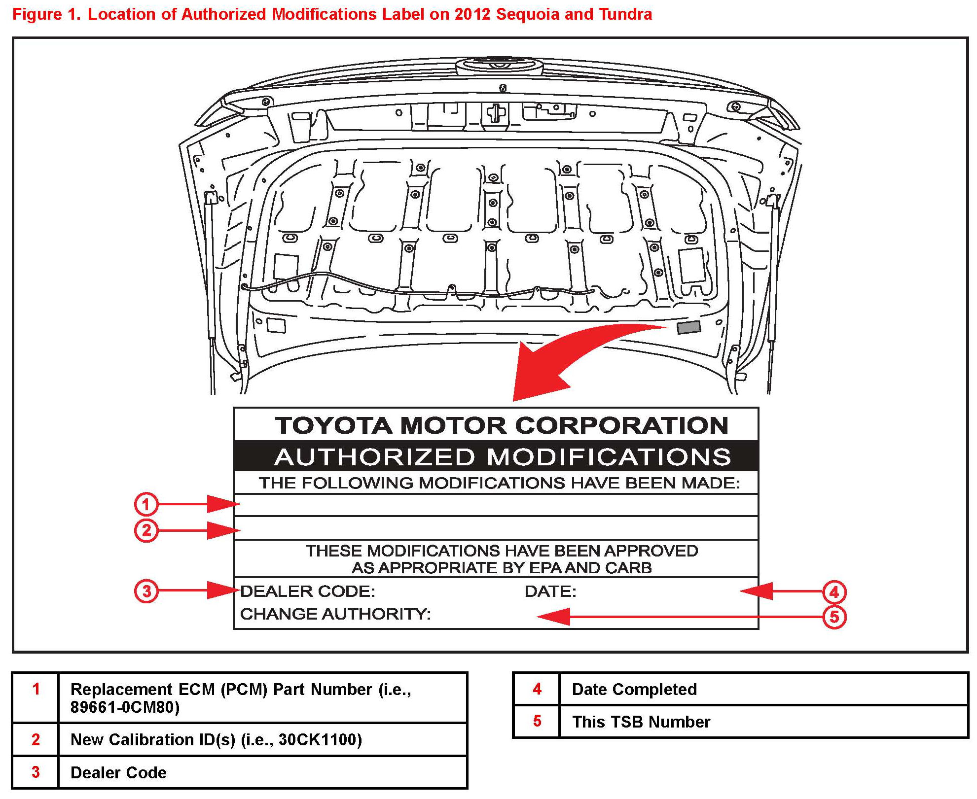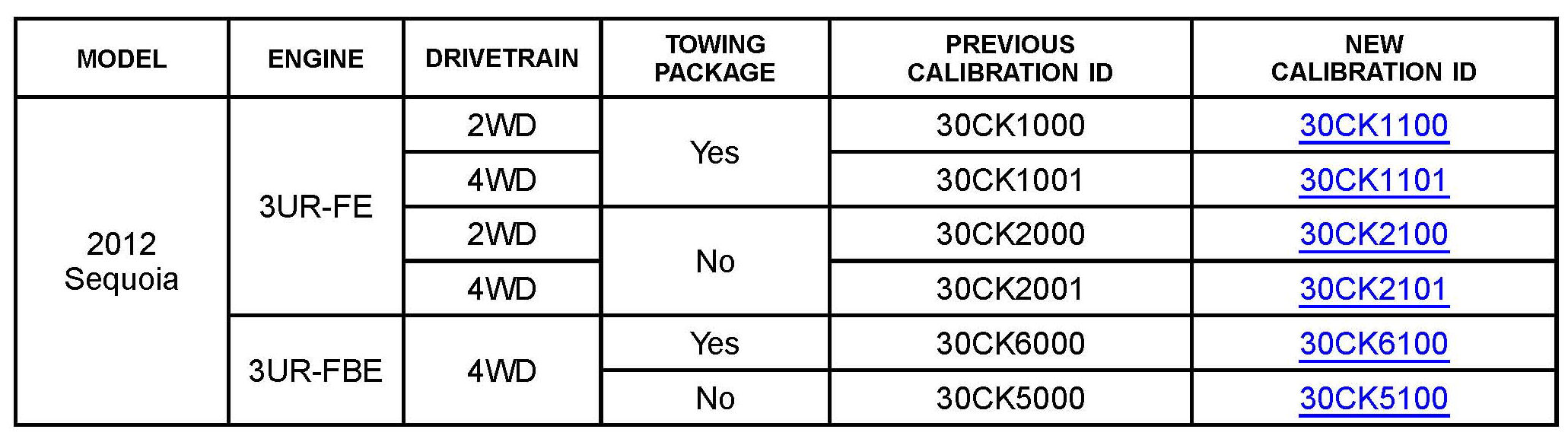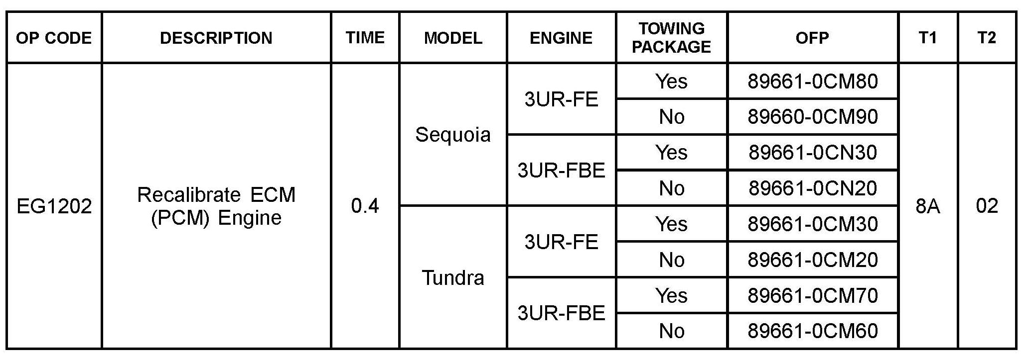 Some 2012 model year Sequoia and Tundra vehicles with the 3UR-FE/FBE (5.7 L) engine may exhibit a MIL "ON" condition with Diagnostic Trouble Code (DTC) P2440/P2442 (Secondary Air Injection System Switching Valve Stuck Open Bank 1/Bank 2) under freezing ambient conditions. The Engine Control Module/ECM (SAE term: Powertrain Control Module/PCM) logic has been revised to address this condition. Use the following repair procedure to recalibrate the ECM (PCM).
