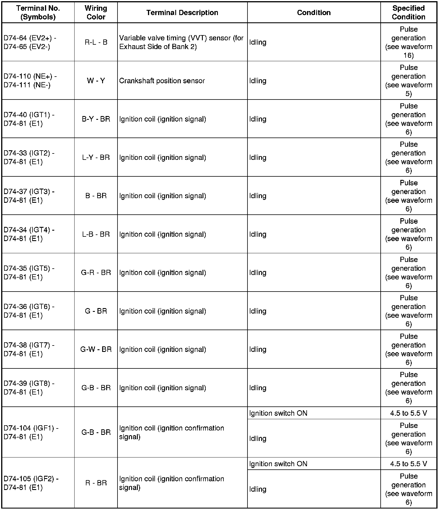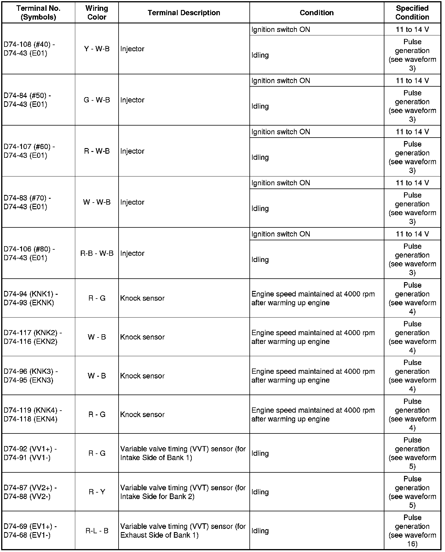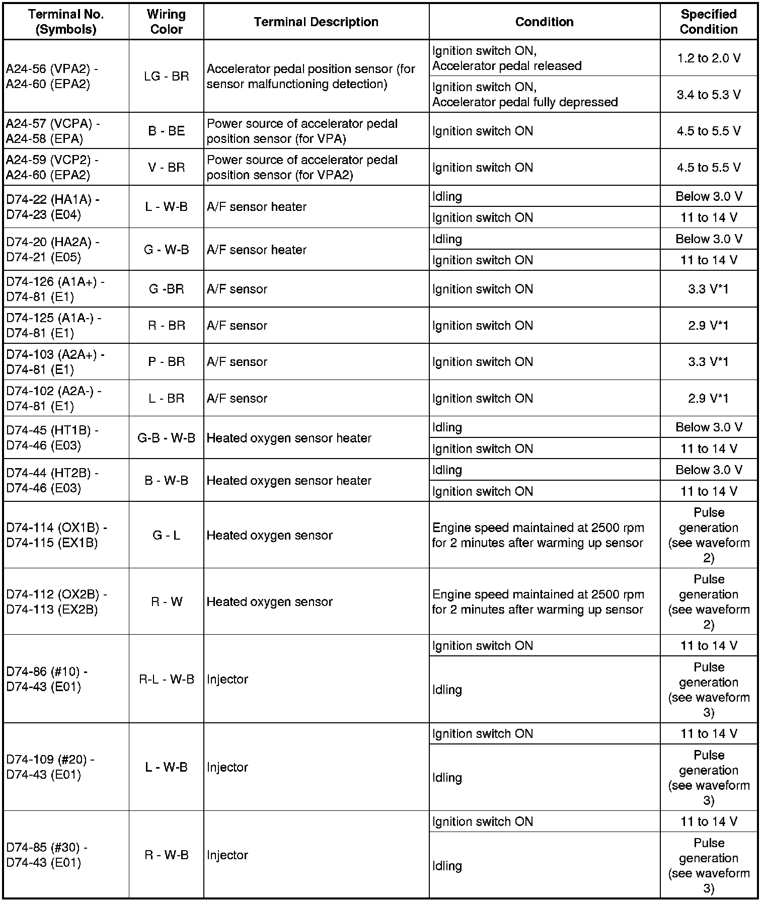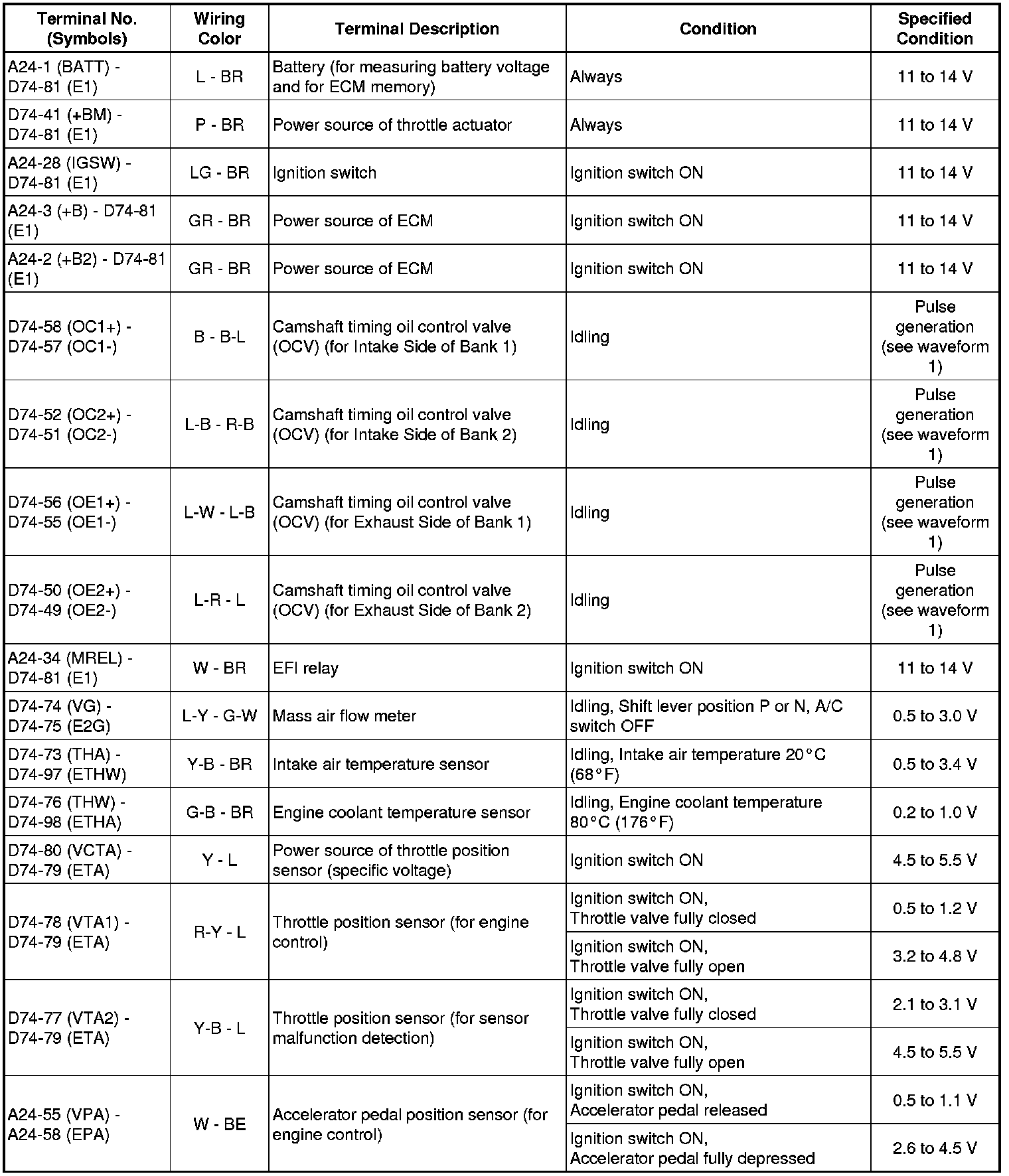 The standard normal voltage between each pair of ECM terminals is shown in the table below. The appropriate conditions for checking each pair of terminals are also indicated. The result of checks should be compared with the standard normal voltage for that pair of terminals, displayed in the Specified Condition column. The illustration above can be used as a reference to identify the ECM terminal locations.