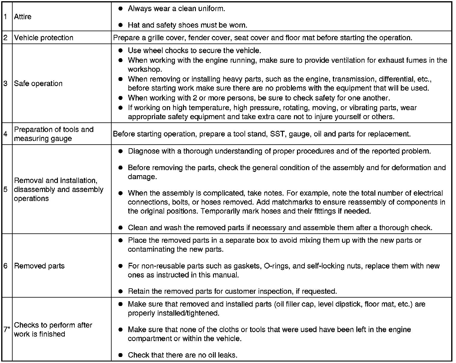 * Failure to carry out service procedures in the correct sequence could cause SRS parts to unexpectedly deploy and possibly lead to serious injuries. Furthermore, if a mistake is made when servicing SRS parts, they may fail to operate when required. Before performing servicing (including installation/removal, inspection and replacement of parts), be sure to read the following precautions.