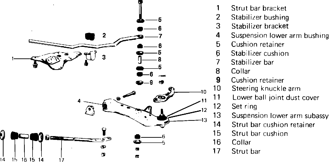 4. Disconnect strut bar (if equipped) and stabilizer bar from lower suspension arm, Fig. 6 .