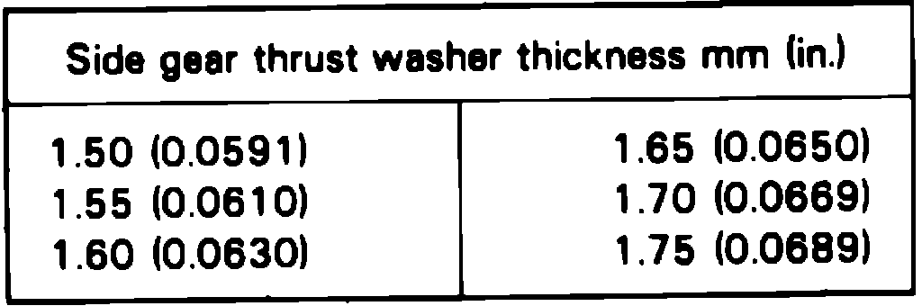 b. If the backlash is not within specified limits, disassemble and after selecting proper side gear thrust washer from Fig. 15 reassemble.