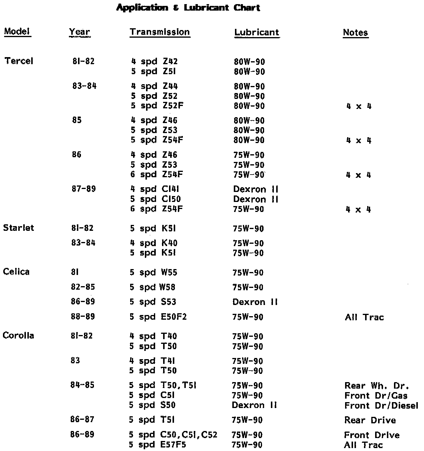 M/T - Application and Lube Chart