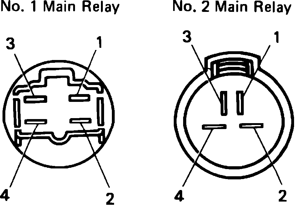 4. Meter should read 40-60 ohms between terminals 1 and 2 on all except Celica relay No. 2, 60-120 ohms between terminals 1 and 2 and on relay No. 2, and meter should indicate no continuity between terminals 3 and 4.