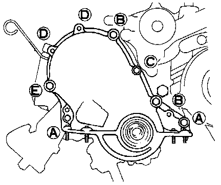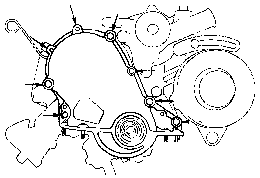 6. Remove the timing chain cover bolts and nuts as shown in the figure.