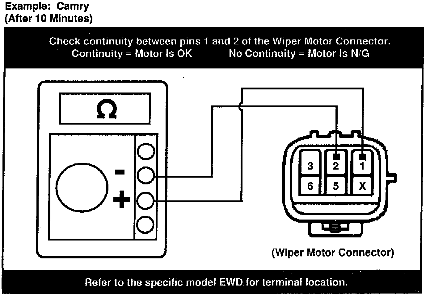 Continuity check can be performed between either the low speed or high speed terminal and the ground terminal of the wiper motor. The standard resistance of a good wiper motor is approximately 1.5 to 4.5 ohms.