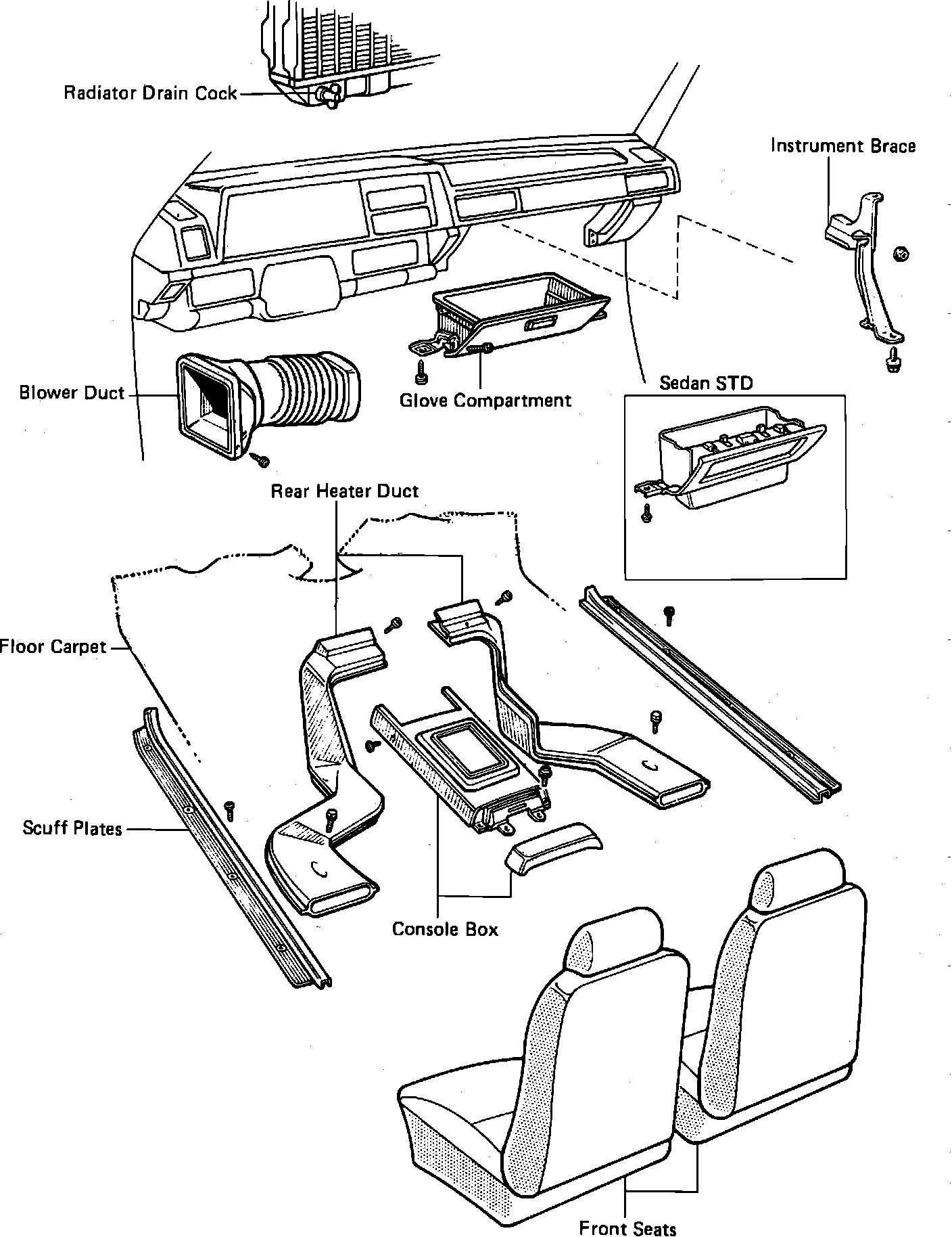 2. Remove console box, scuff plate, front seat, floor carpet, rear heater duct, glove compartment, blower duct, instrument brace and ash receptacle and retainer, Fig. 5.