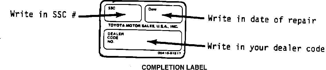 1) After completing repair and before returning the vehicle to a customer, a SSC completion label must be affixed to the firewall next to the factory I.D. plate.