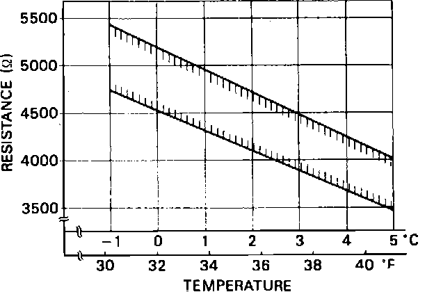 5. If thermistor resistance does not change within ranges shown in chart, Fig. 18, thermistor is defective. Intersection point of water temperature and measured thermistor resistance should fall between lines on graph, Fig. 18.