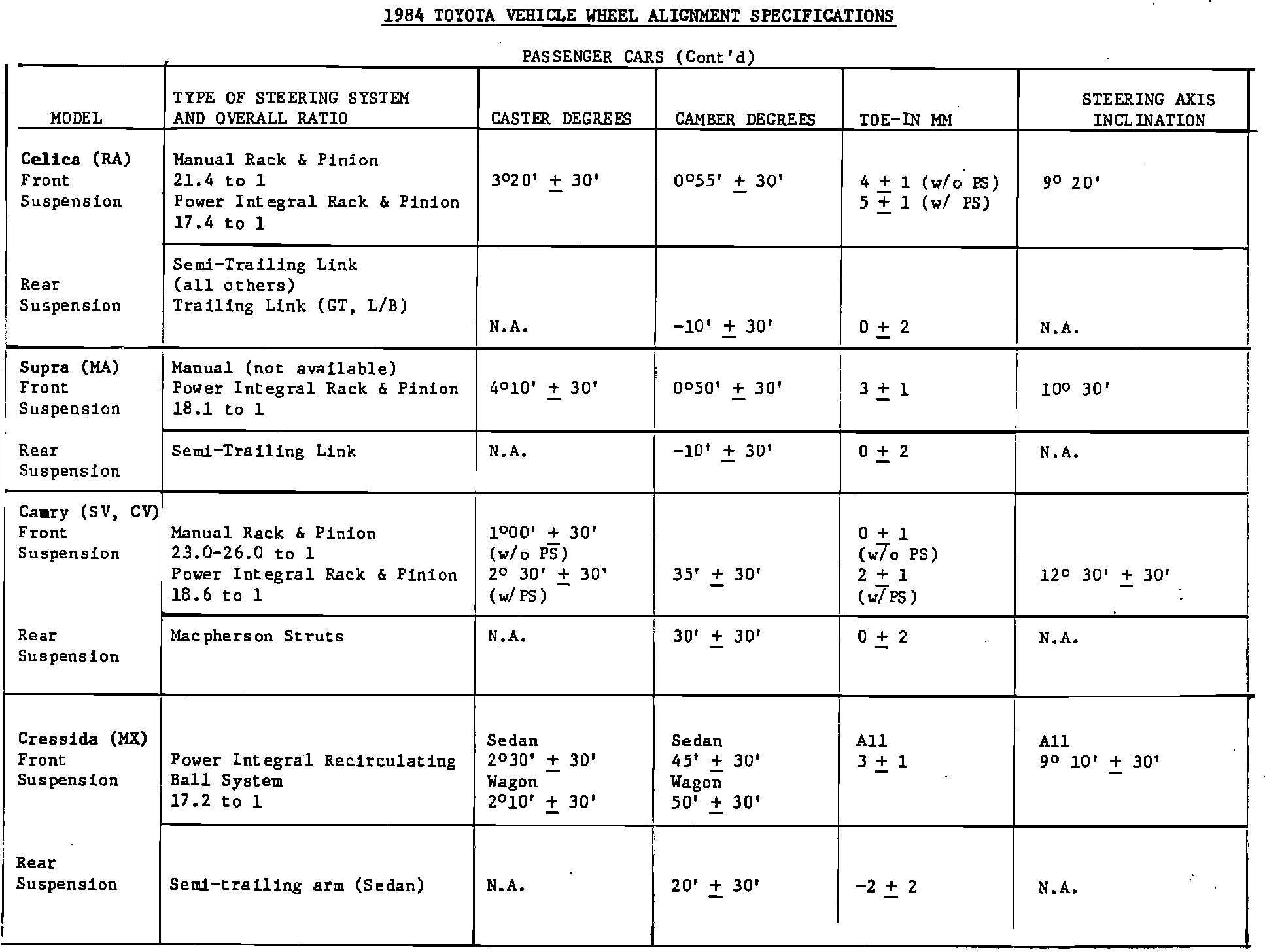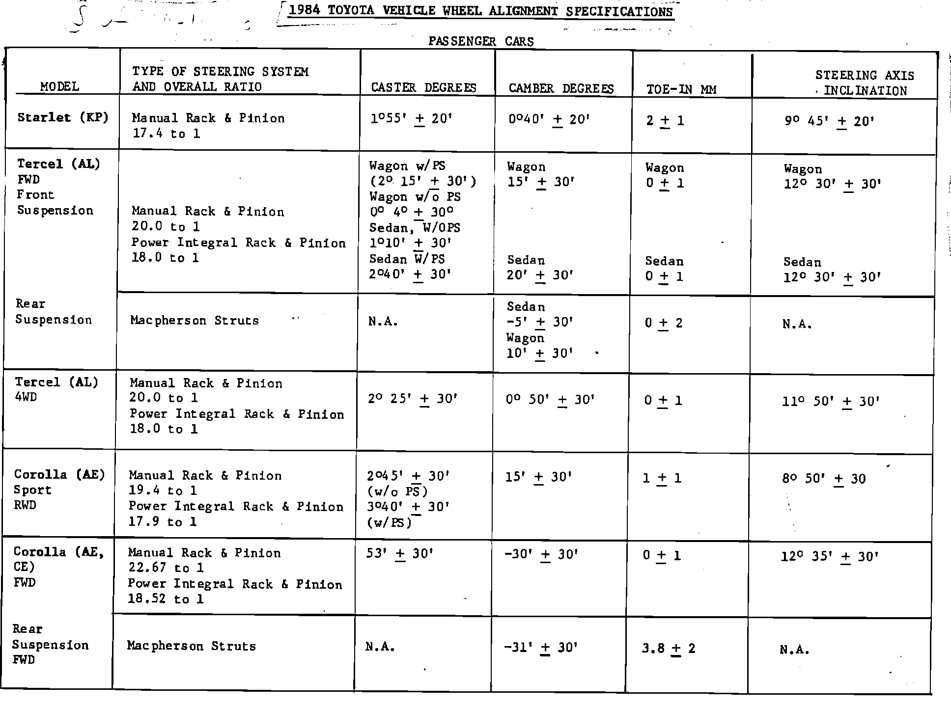 1984 Toyota Vehicle Wheel Alignment Specifications