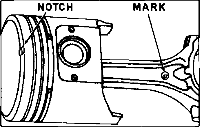Pistons are available in standard and oversize of .020 inch (.50 mm), .030 inch (.75 mm) and .040 inch (1.00 mm) for all engines except 3E, 3S-FE, 3S-GE, 4A-C, 4A-LC, 4A-GE, 4A-GEC, 4A-GEL, 4A-GELC, 4Y-EC, 7M-GE, 7M-GTE, 22R, 22R-E and 22R-TE engines. On 22R, 22R-E and 22R-TE engines, pistons are available in standard and oversize of .020 inch (.50 mm) and .040 inch (1.00 mm). On 2VZ-FE, 3E, 3VZ-E, 4A-C, 4A-GZE, 4A-LC, 4Y-EC, 7M-GE and 7M-GTE engines, pistons are available in standard and oversize of .020 inch (.50 mm). On 3S-FE, 3S-GE, 3S-GTE, 4A-GE, 4A-GEC, 4A-GEL and 4A-GELC engines, if piston bore is not within specifications, replace piston and/or cylinder block. When assembling piston onto connecting rod, ensure mark on top of piston and mark on connecting rod are on same side, Figs. 125 through 128. When installing piston and connecting rod assembly, ensure mark on top of piston is facing toward front of engine.Fig. 128 Piston & connecting rod assembly. 5M-GE, 7M-GE, 7M-GTE, 22R, 22R-E & 22R-TE engines: