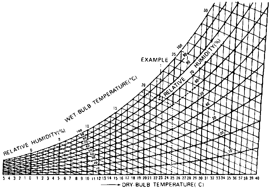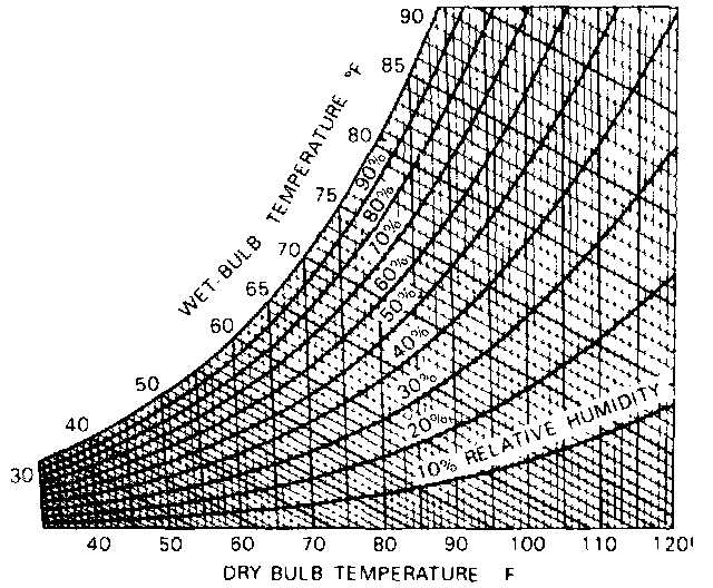 For example, if dry-bulb temperature is 90°F, and wet-bulb temperature is 78°F, the relative humidity is 60%.