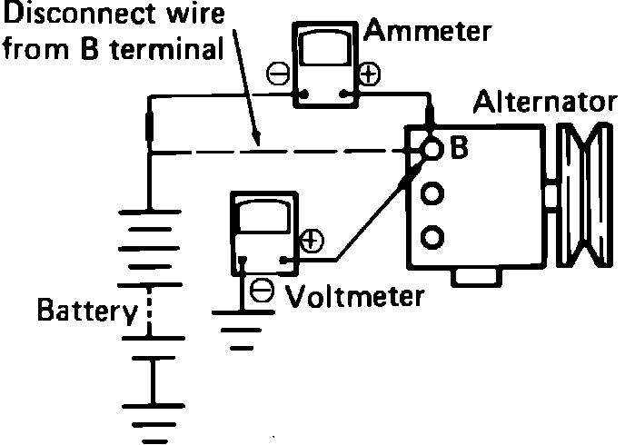 1. Disconnect the wire from terminal B of the alternator and connect it to the negative terminal of the ammeter.