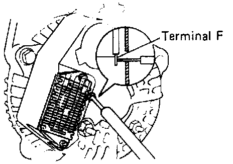 3. If the voltage reading is less than spec ground terminal F of the alternator as shown, start the engine and check the voltage reading of terminal B.