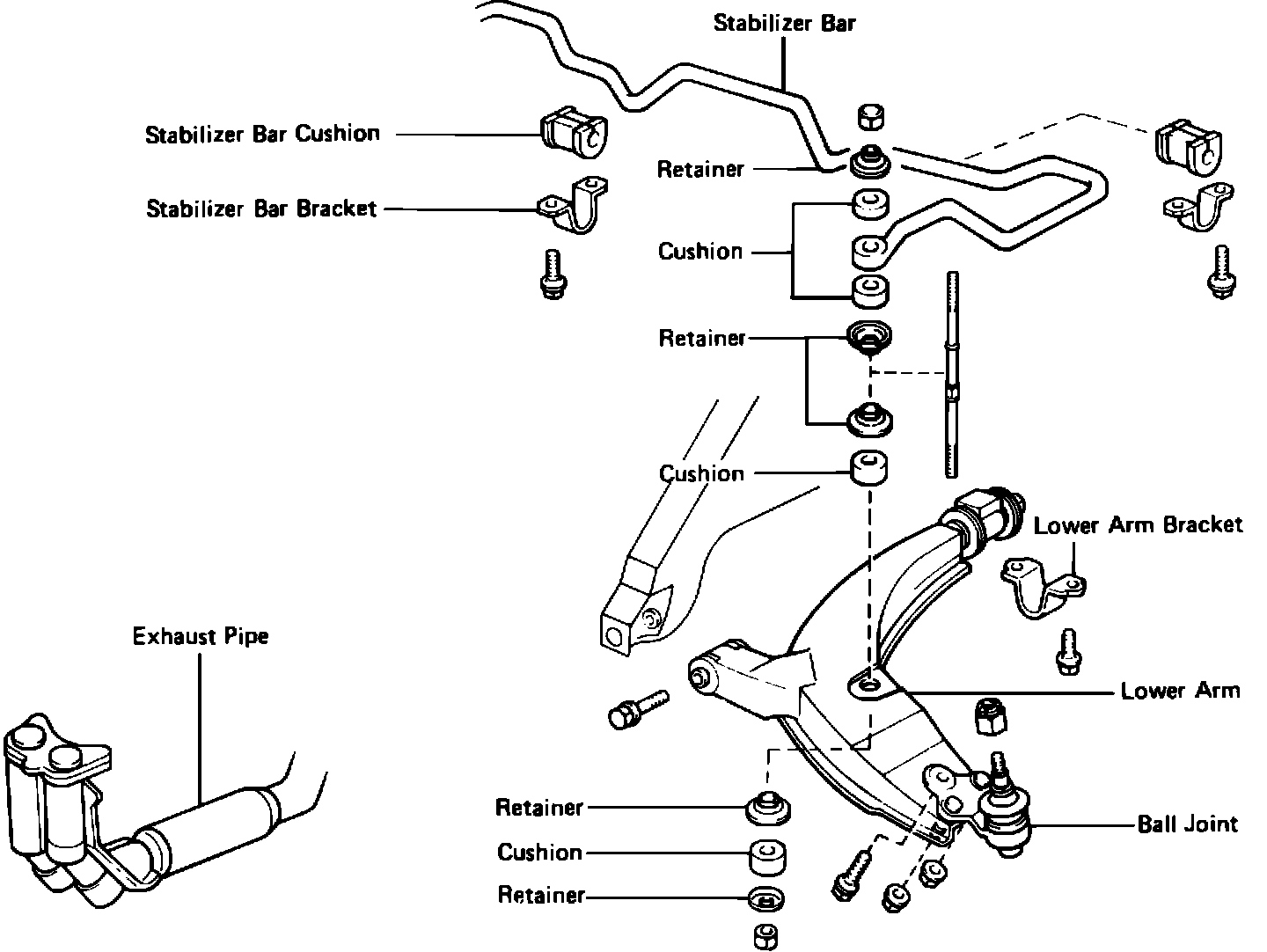 5. Reverse procedure to install, noting the following torque specifications: ball joint nuts and bolts, 47 ft. lbs. (64 Nm); stabilizer bar to lower control arm, 13 ft. lbs. (18 Nm); front bracket bolt, 83 ft. lbs. (113 Nm) on 1984-85 models or 105 ft. lbs. (142 Nm) on except 1984-85 models; and rear bracket bolts, 64 ft. lbs. (87 Nm).