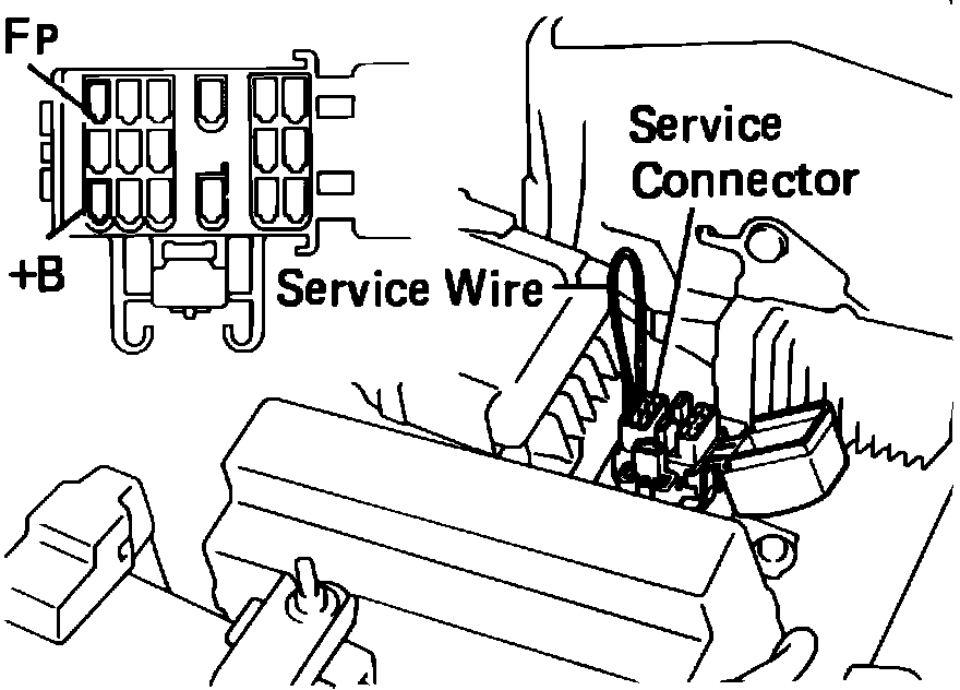 1. Turn on ignition but do not start engine. Then connect terminals of fuel pump check connector with jumper wire as shown in image above. Connector is located adjacent to the Fuse Relay block in the engine compartment.
