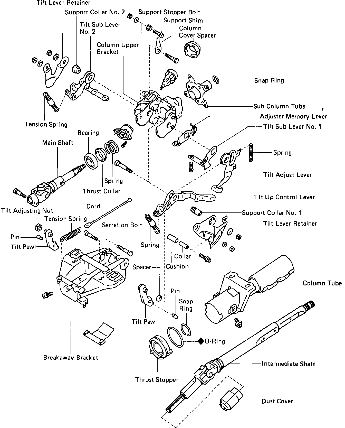 Fig. 5 Exploded view of steering column. 1986 Celica with tilt column: