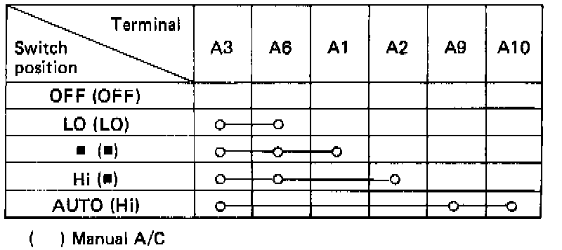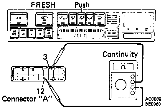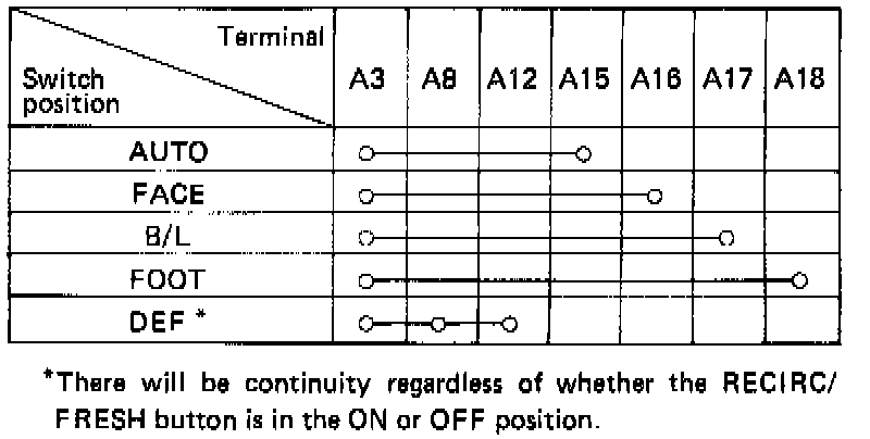 b. With the RECIRC/FRESH control button pushed in (FRESH) and any mode button except DEF on, check that there is continuity between terminals A3 and A12.