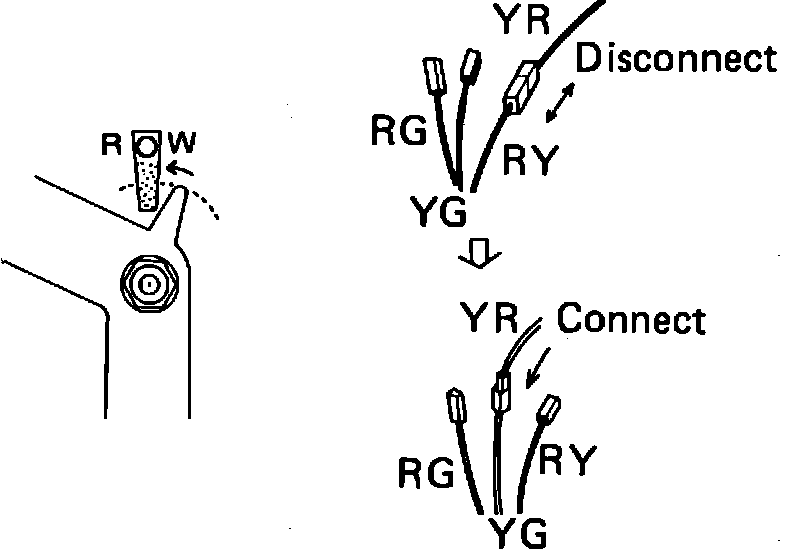 3. Place blower motor switch in "Auto" position, then verify lower edge of guide plate on servo motor is positioned at "O" mark, between "R" and "W" lines on servo motor shaft. If edge is not positioned as described, adjust by changing terminal position in A/C wire harness. Normally, the RY and YR terminals are connected.