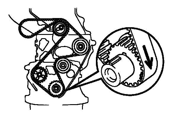 NOTE: If reusing the timing belt, align the points marked during removal, and install the belt with the arrow pointing in the direction of engine revolution.