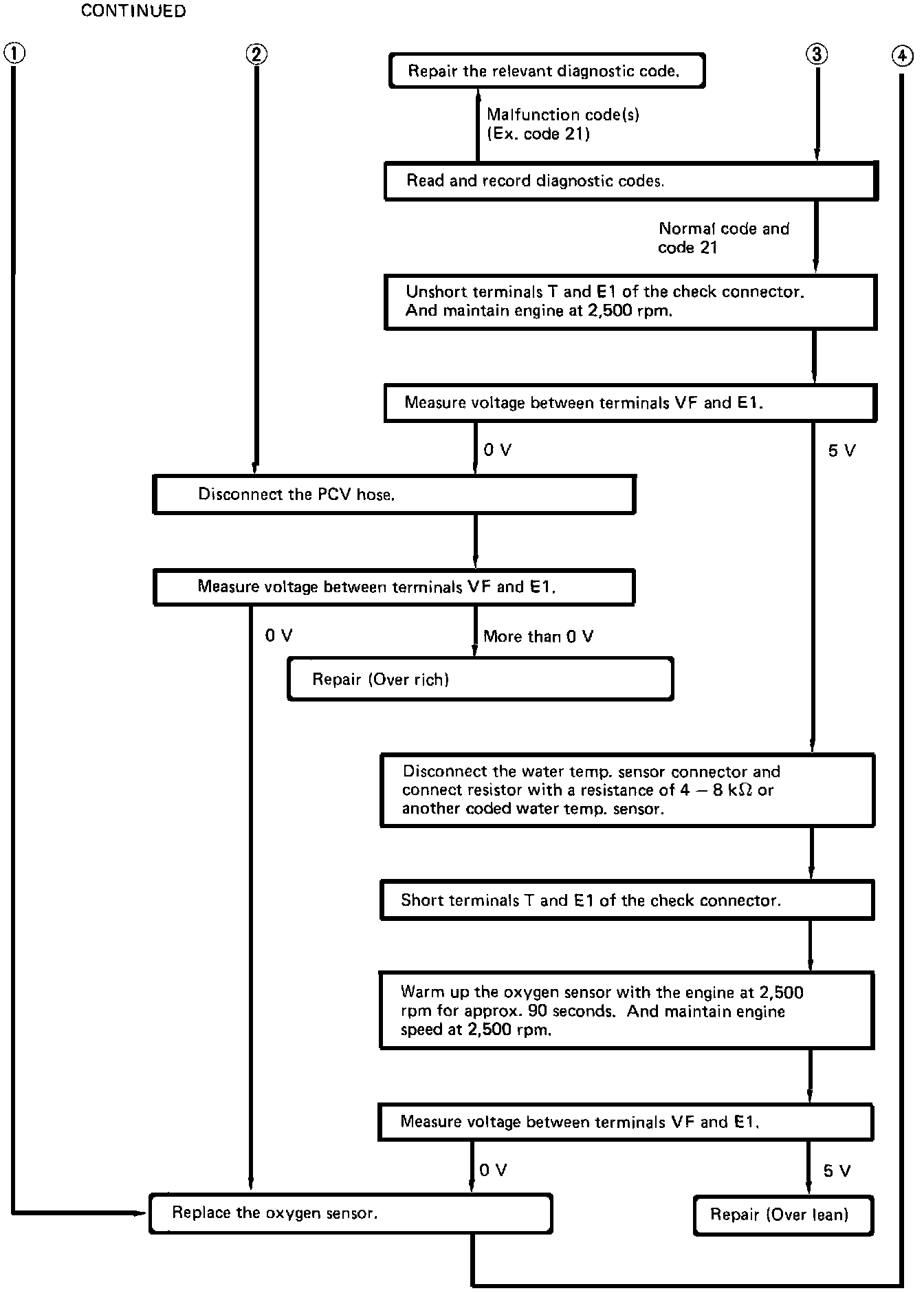 - Connect the positive (+) probe of a voltmeter to terminal VF of the check connector, and negative (-) probe to terminal E1.