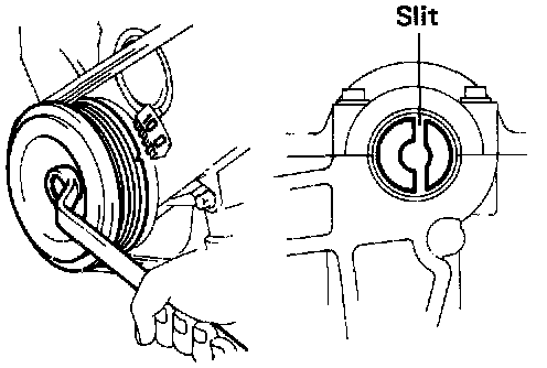 - Turn the crankshaft clockwise, and position the slit of the intake camshaft as shown.