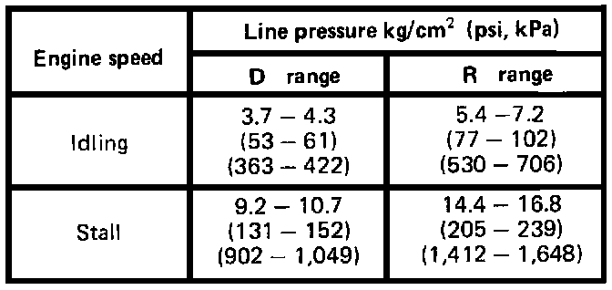 c. Shift into D range, step down strongly on the brake pedal with your left foot and while manipulating the accelerator pedal with the right foot, measure the line pressure at the engine speeds specified in table.