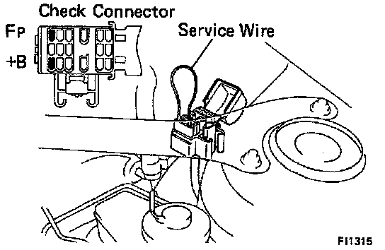 1. Turn on ignition but do not start engine. Then connect terminals of fuel pump check connector with jumper wire, Fig. 000