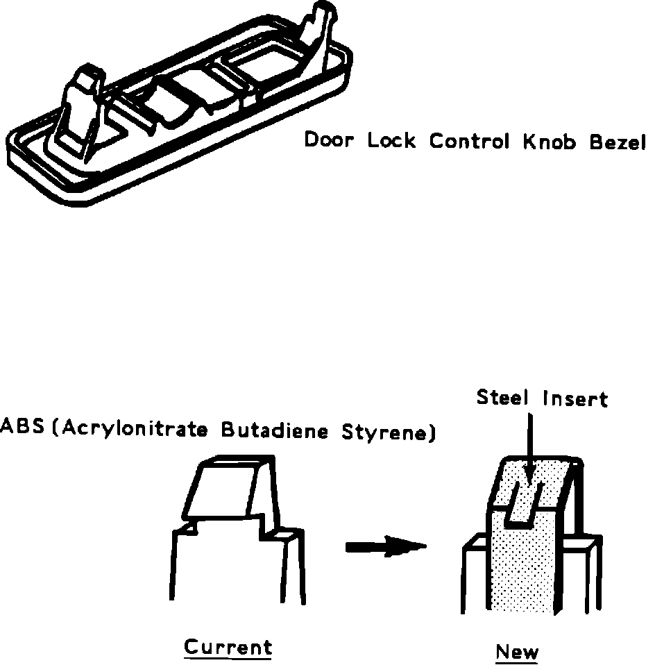 To improve durability of the door lock control knob bezel, the shape of the tab has been modified and a steel insert has been added as shown below.