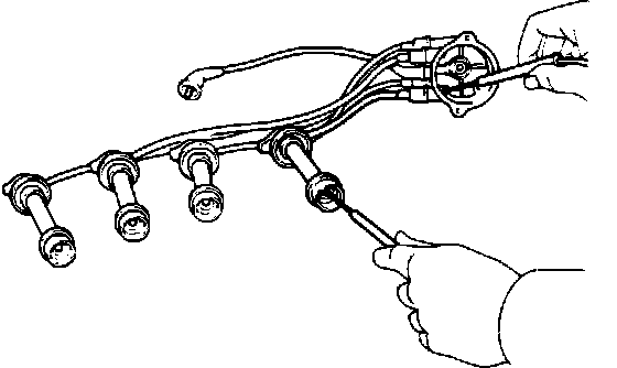 CAUTION: Carefully remove the ignition wires by pulling on the rubber boots. Do not bend the wire or the conductor may be broken.