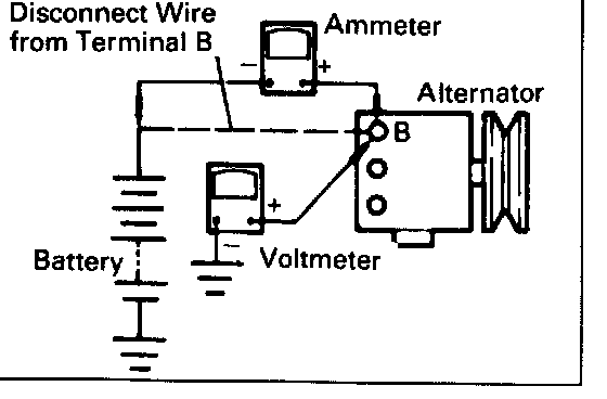 a. Disconnect wire from terminal B of alternator, then connect ammeter negative probe to the wire.