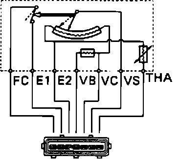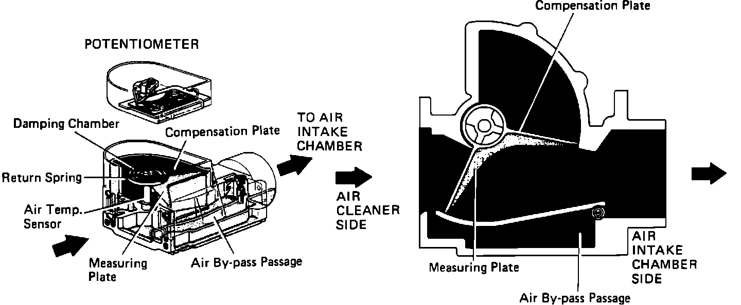 A Bosch vane type airflow meter is mounted in the air induction system near the air cleaner. The airflow meter measures intake air volume, and converts these readings into voltage signals by means of a variable resistor (potentiometer). These voltage signals are then sent to the ECU and used to determine injection duration and proper fuel delivery. When intake air volume is low, the voltage is high; when the intake air volume is high, the voltage signal is approximately zero.