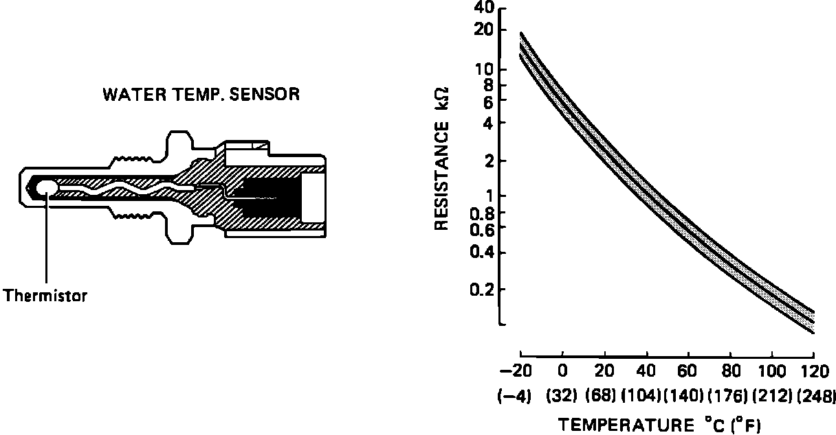 The Coolant Temperature Sensor, located in the rear of the engine, monitors coolant temperature with a thermistor whose resistance varies according to engine temperature. The ECU uses this signal to control open/closed loop operation of the fuel injection system, overdrive on electronic transaxles, spark advance (ESA), idle speed control system and EGR system. The THW inputs the ECU through terminal THW.
