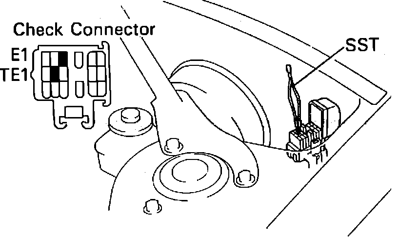 4. Using a service wire, short terminals TE1 and E1 of the check connector, (located in the engine compartment). Fig. 56