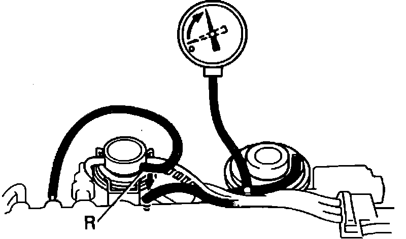 1. Using a three-way connector tee, connect a vacuum gauge in the line between the EGR valve and the EGR vacuum switching valve (VSV). Fig. 55