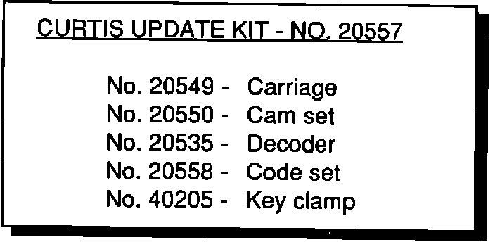 Because of this new key and lock design, cutting replacement keys will require an update kit for your Curtis Industries key cutter. The update kit, No. 20557, contains the following necessary cutting equipment: