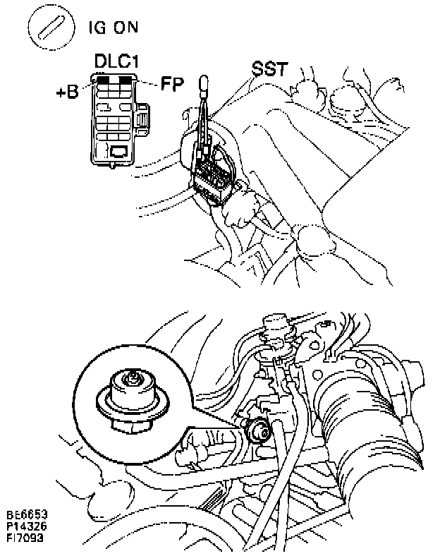 ^ Turn Ignition Switch ON. Using jumper connect terminals FP and + B of Data Link Connector 1 (SST 09843-18020).