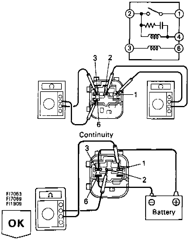 ^ Apply battery voltage between terminals 3 and 6. Check continuity between terminals 1 and 2.