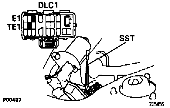 - Using a jumper wire (or SST), connect terminals TE1 and E1 of the data link connector 1 (SST 09843-18020).