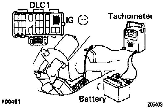 IGNITION TIMING INSPECTION PROCEDURE1. CONNECT THE TEST PROBE OF A TACHOMETER TO TERMINAL IG (-) OF THE DATA LINK CONNECTOR 1.